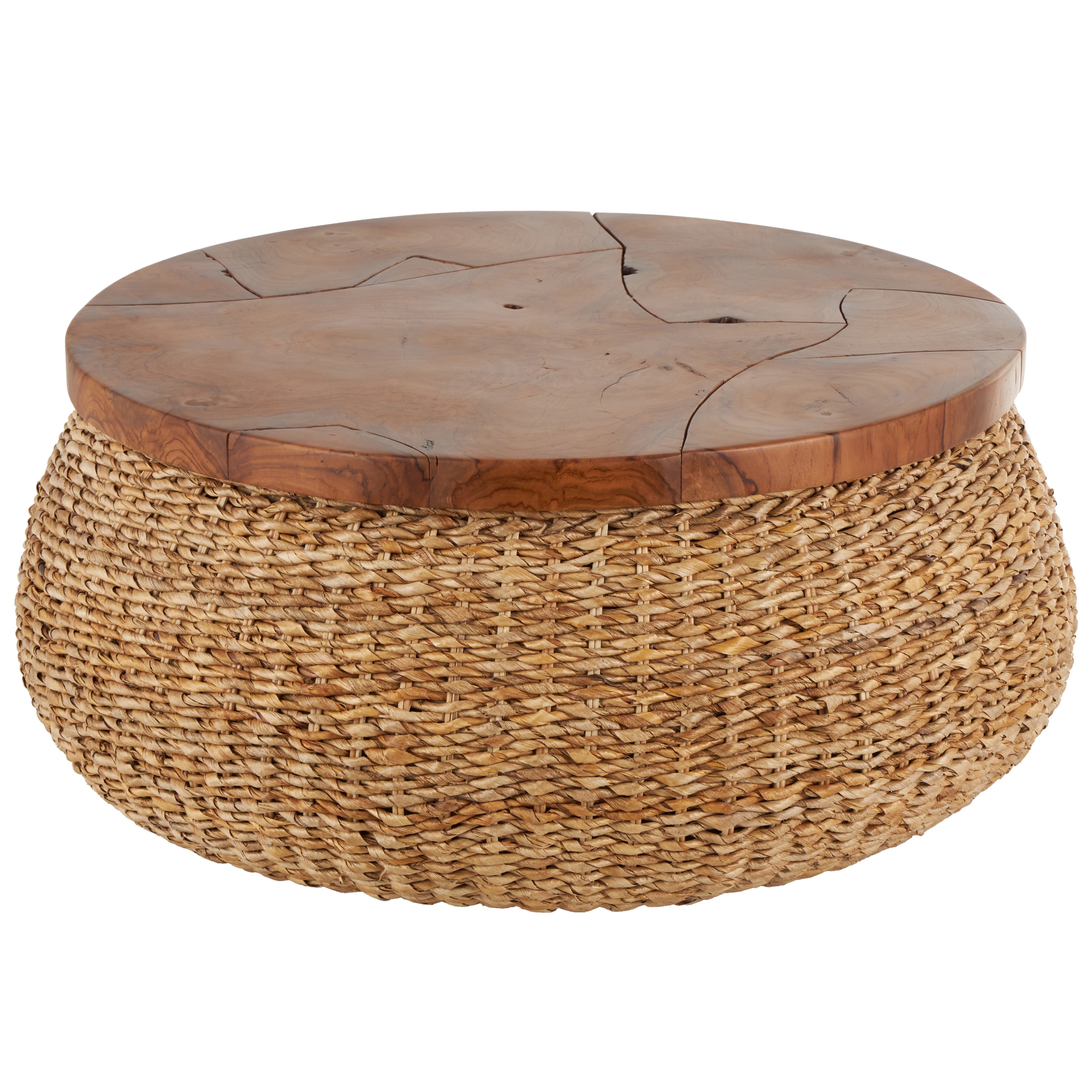 Brown Rattan Wrapped Living Room Coffee Table with Teak Tabletop - 35"W x 35"L x 15"H