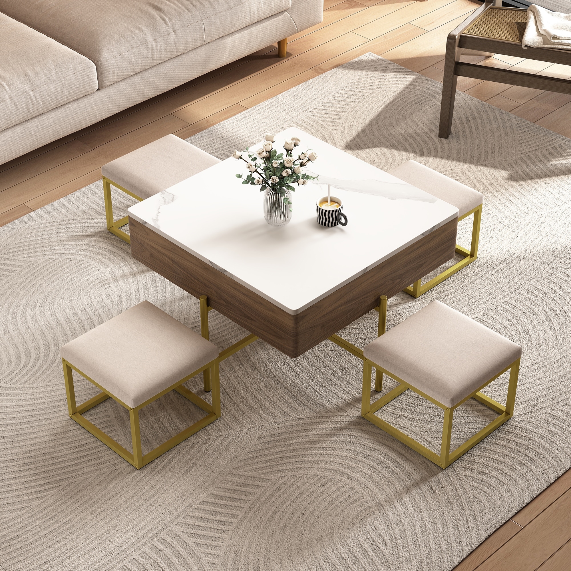 Square Lift-Top Coffee Table Set with Storage & 4 Ottomans