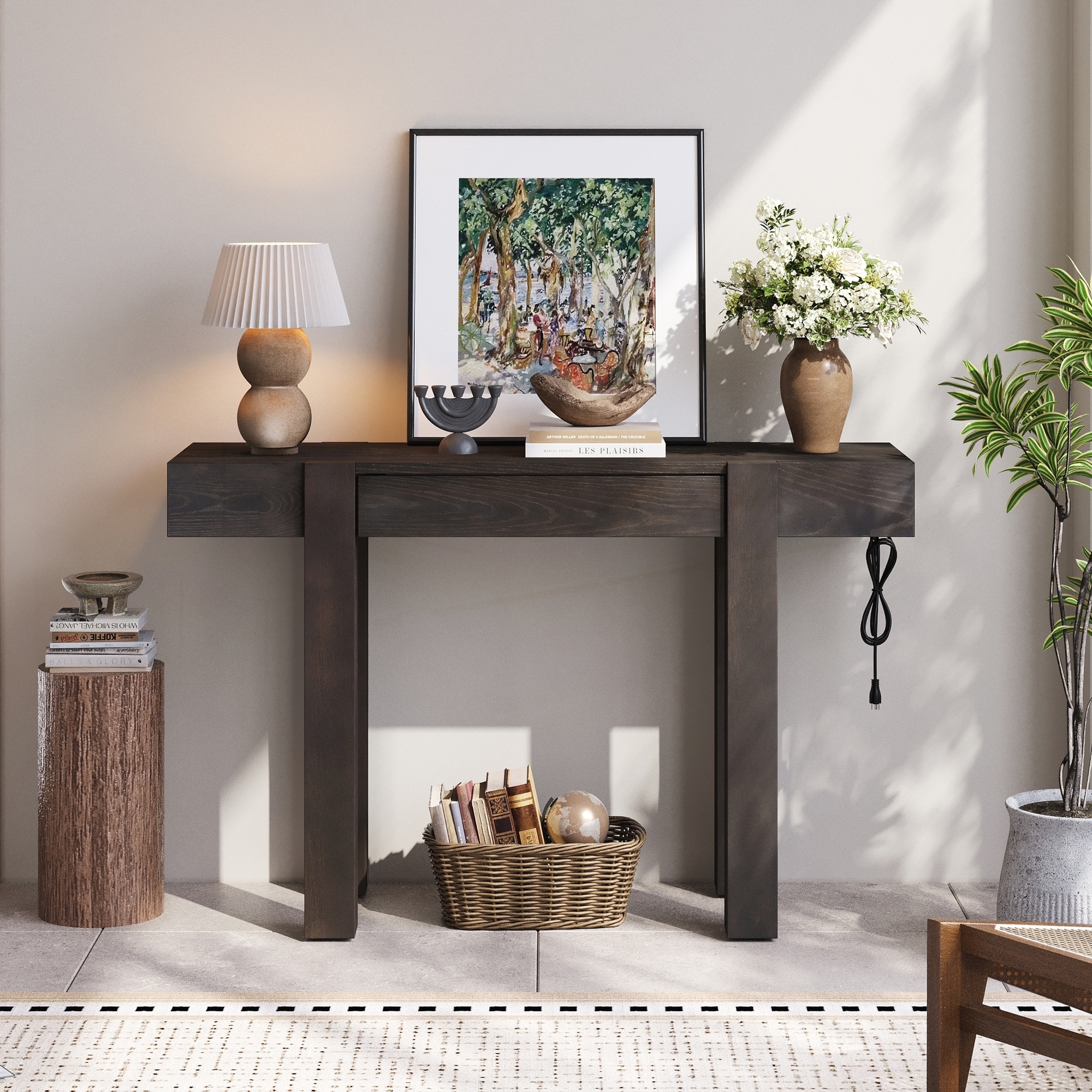 59.8'' Wooden Console Table with Oak Veneer Top,Farmhouse Entryway Table with Rubber Wood Slender Curved Legs