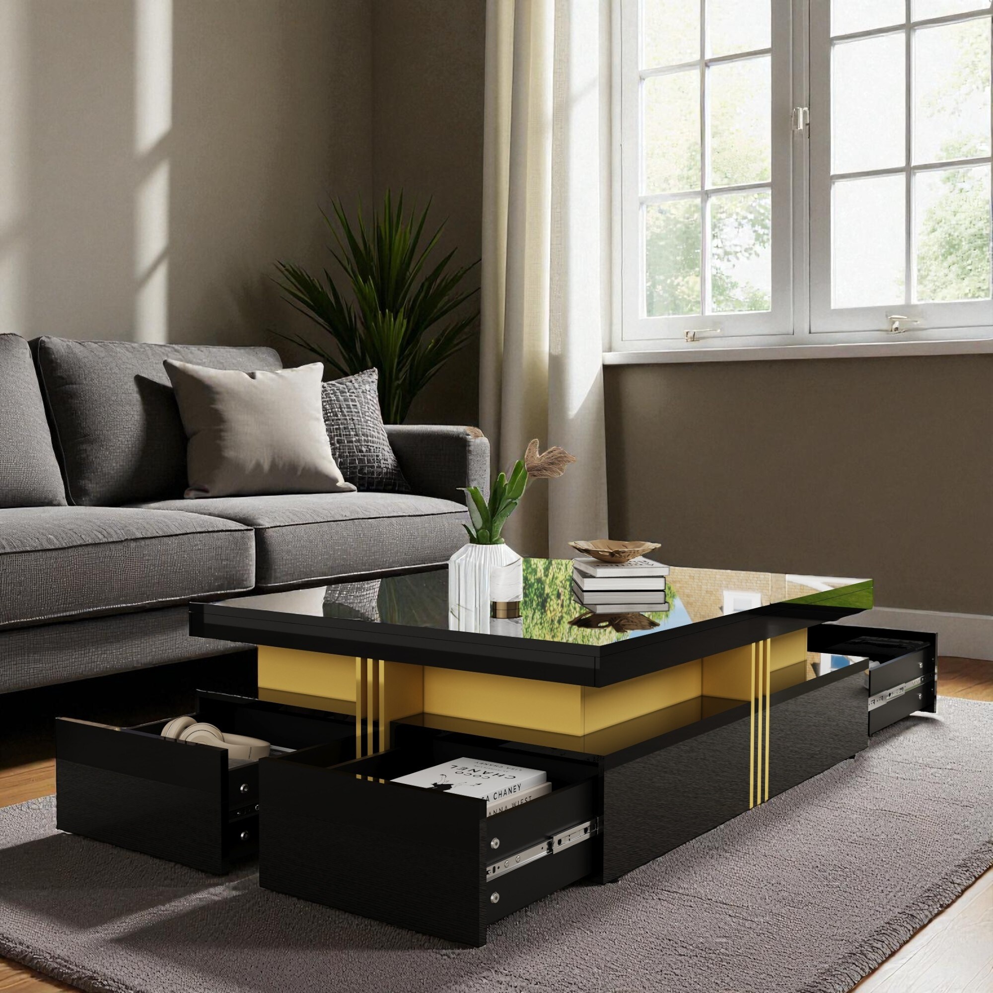 Square Coffee Table with 4 Drawers, Glossy Finish Storage Center Table with Large 43.3 Inch Top, Accent Trim - MDF