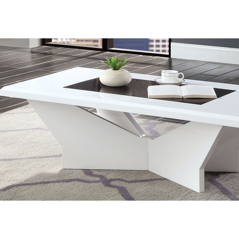 White Finish 1pc Coffee Table Contemporary style high Gloss Top Tempered Glass Geometric Base white (Only Including Table)