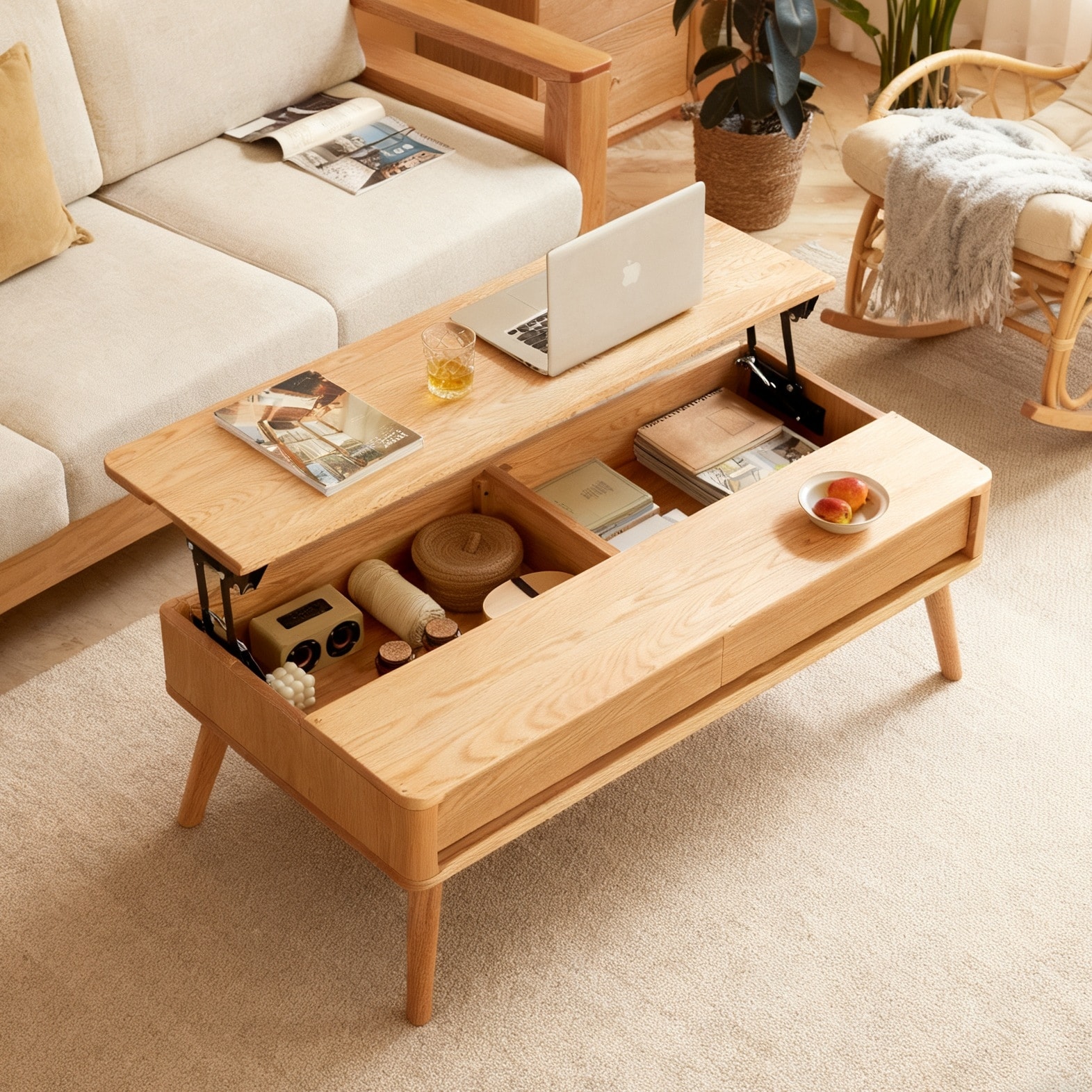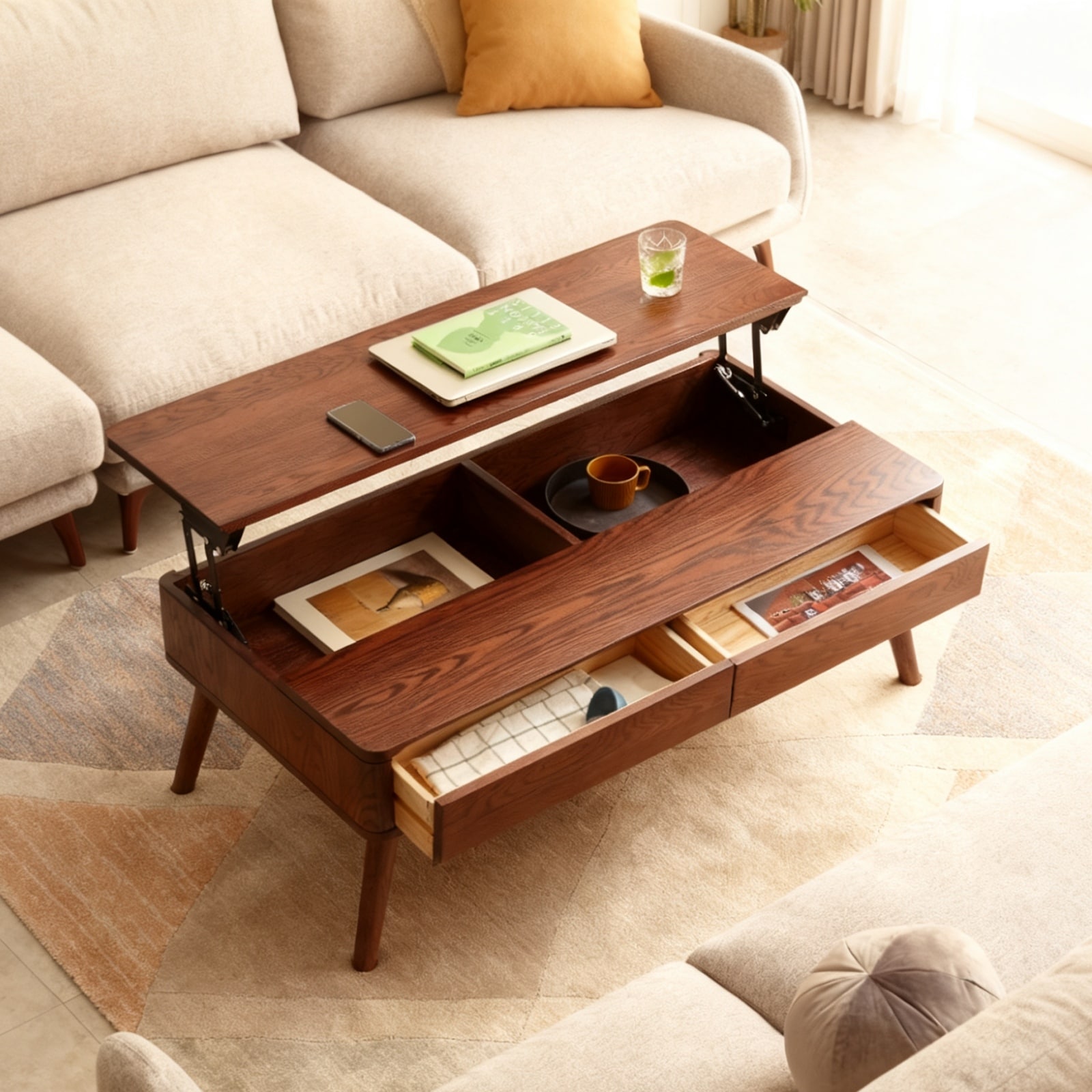 Solid Wood Elevating Center Table Storage Coffee Table with 2 Drawers