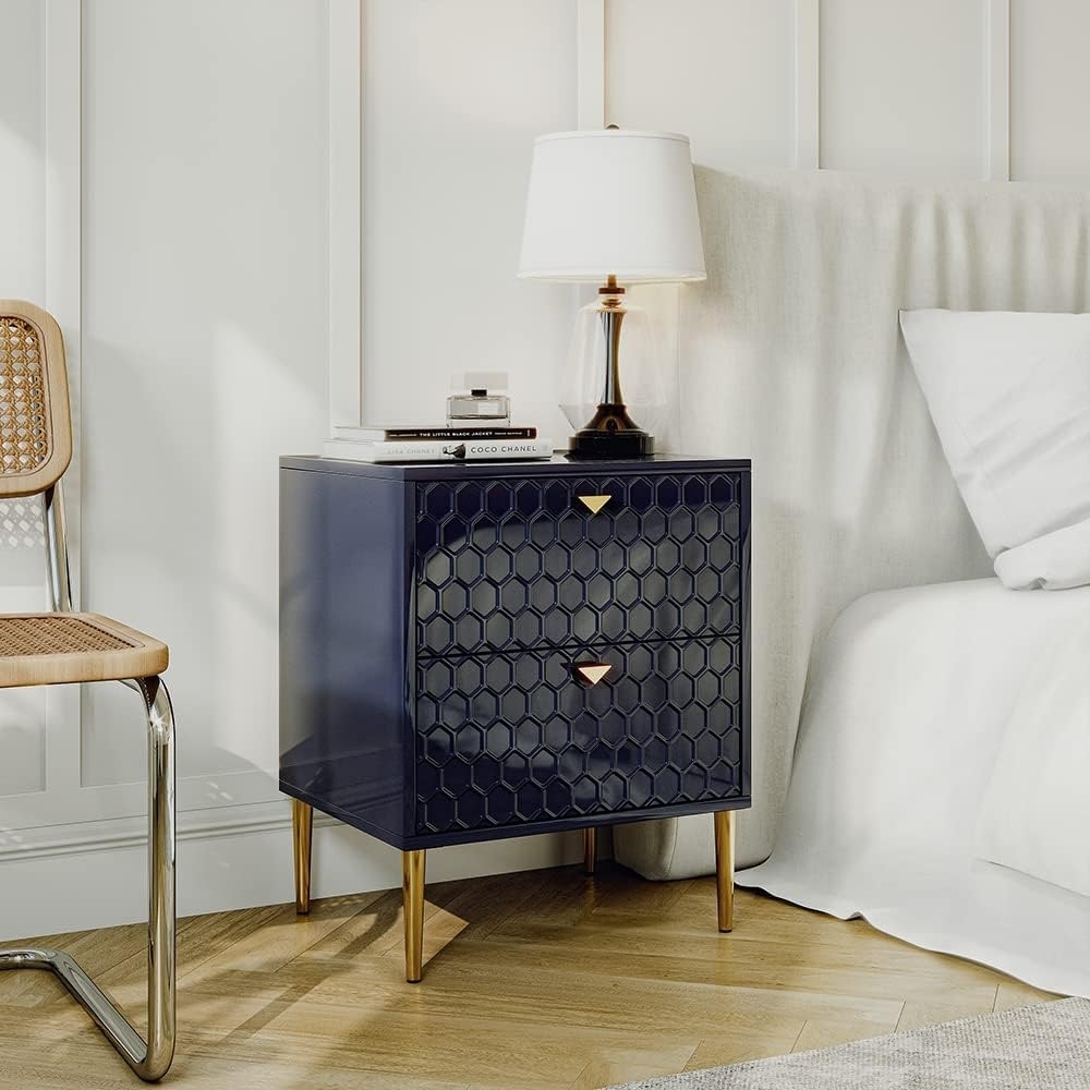 Modern Blue Nightstand with 2 Drawers & Brass Knobs, Compact Bedside Table for Bedroom or Living Room