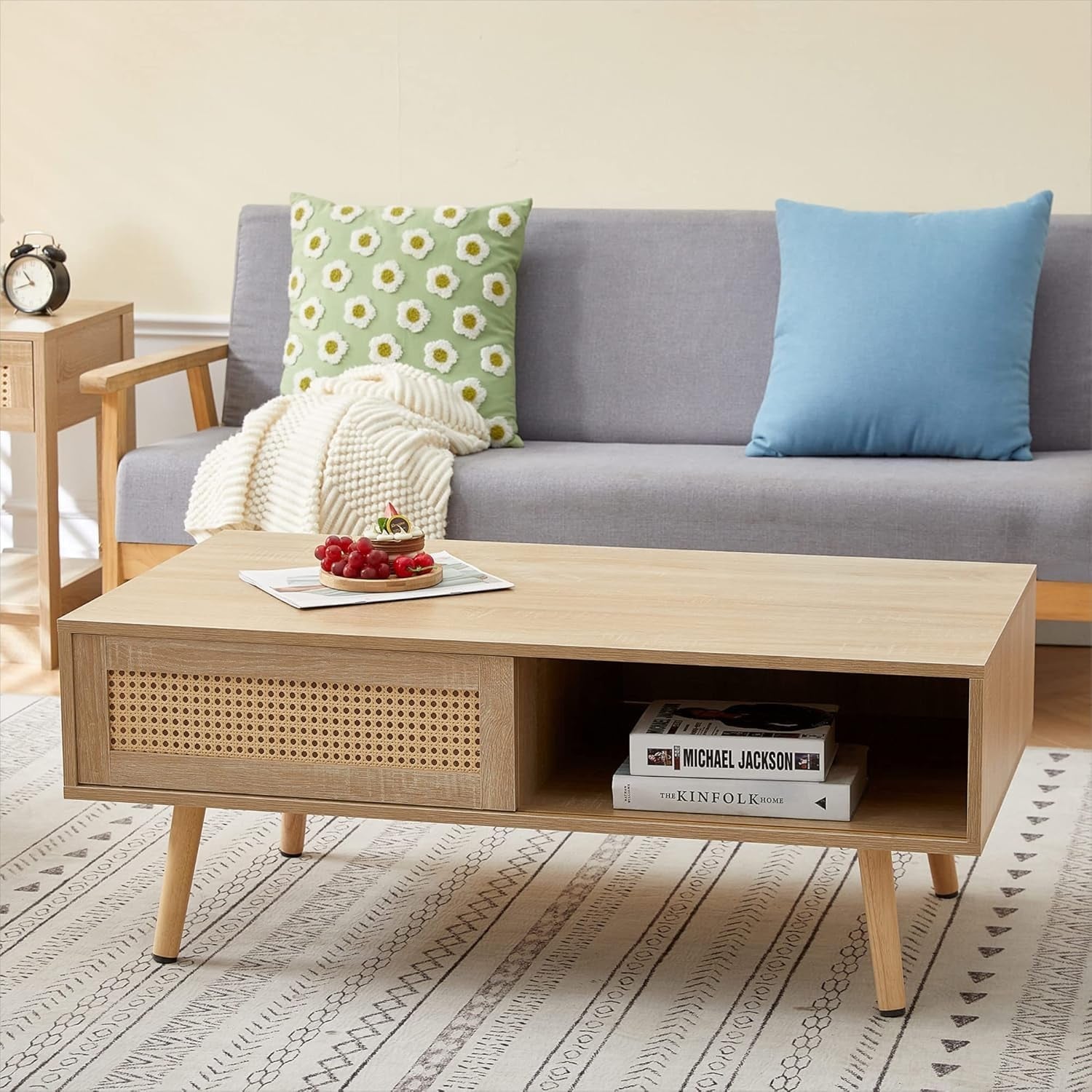 Rattan Coffee Table with Sliding Doors & Open Shelf, Mid-Century Design for Small Spaces, Natural Finish