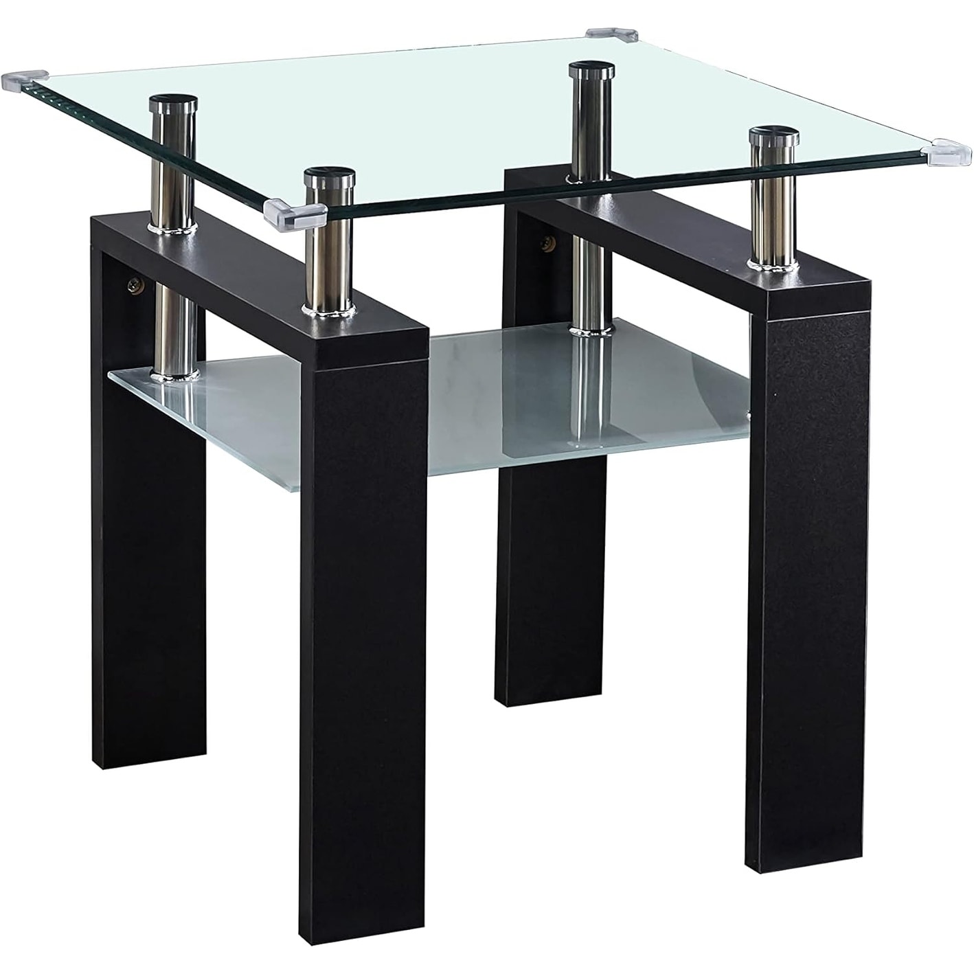 Glass End Table, 2-Tier Corner Side Table with Wood Legs & Open Shelf for Living Room, Bedroom (Black)