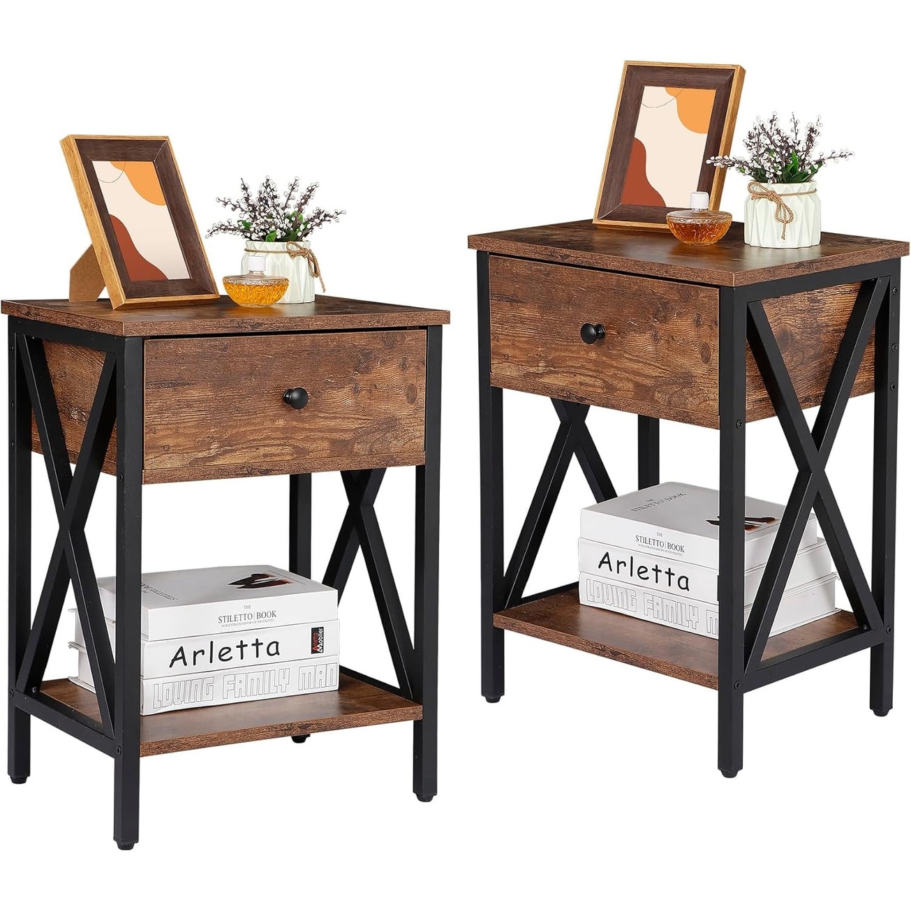 End Table Nightstand with Drawer & Shelf, Industrial Bedside Table with X Frame for Bedroom or Living Room, Rustic Brown