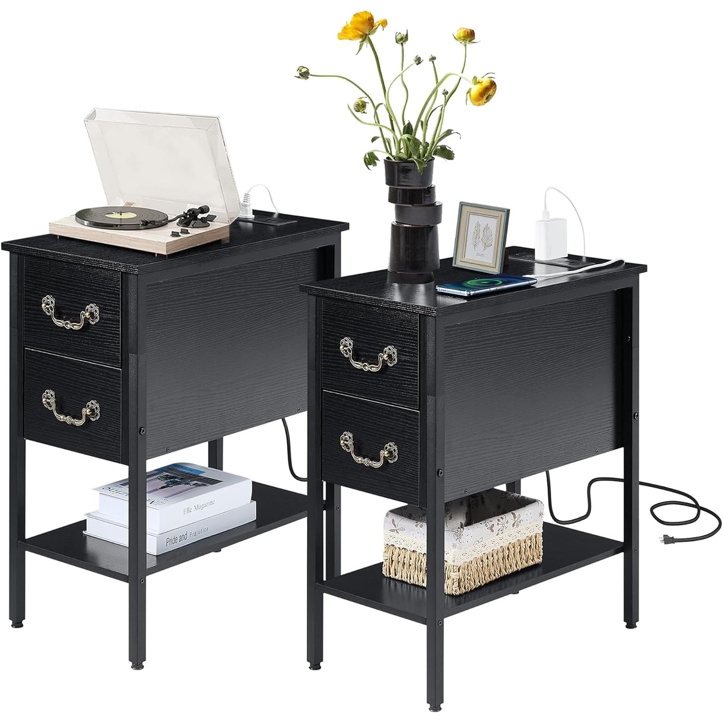 Slim Nightstand Set of 2 with USB Charging & Drawers, Narrow Side Tables for Bedroom or Living Room