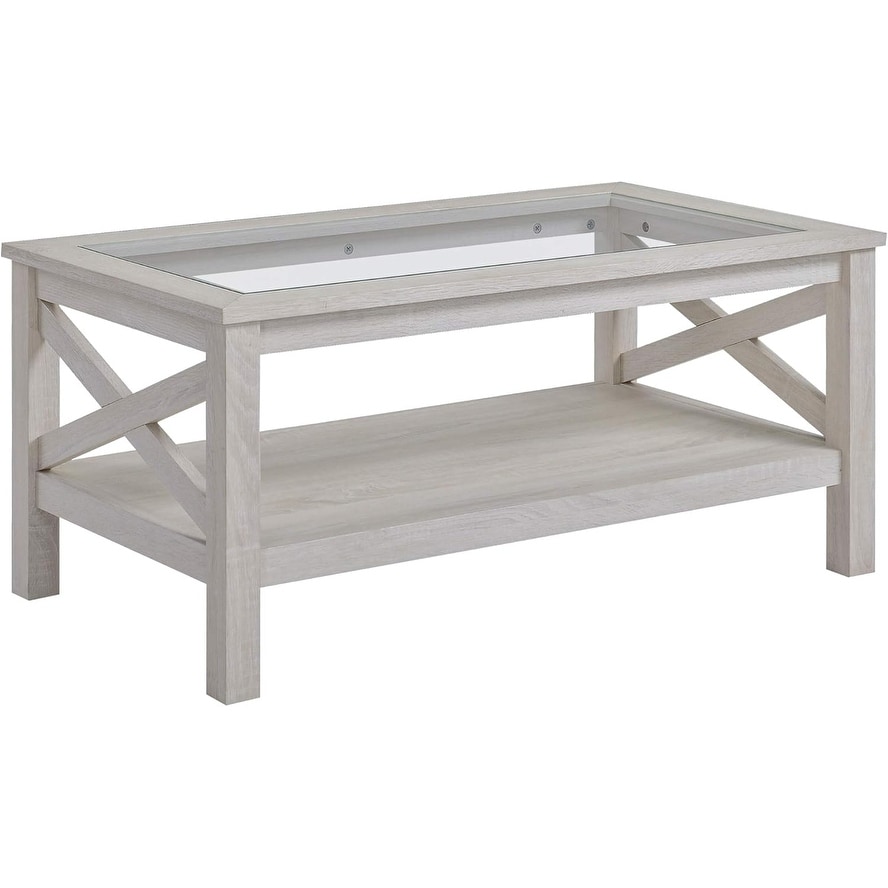 Rustic Coffee Table with Wood Frame, Glass Top & Storage Shelf, Living Room Side Table, 39.25"x21.75", White Oak
