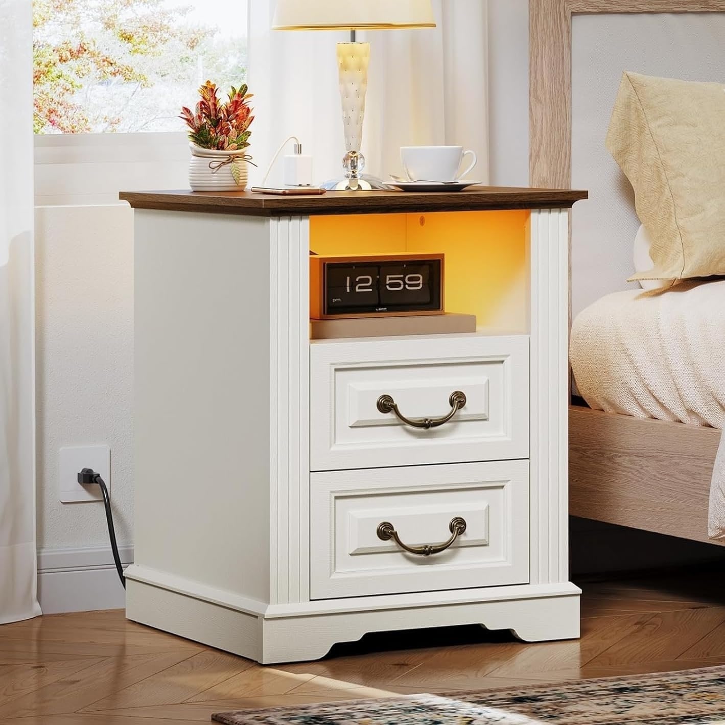 Rustic Wooden Nightstand with Charging Station & 2 Drawers, LED Bedside Table for Bedroom or Living Room, White and Walnut