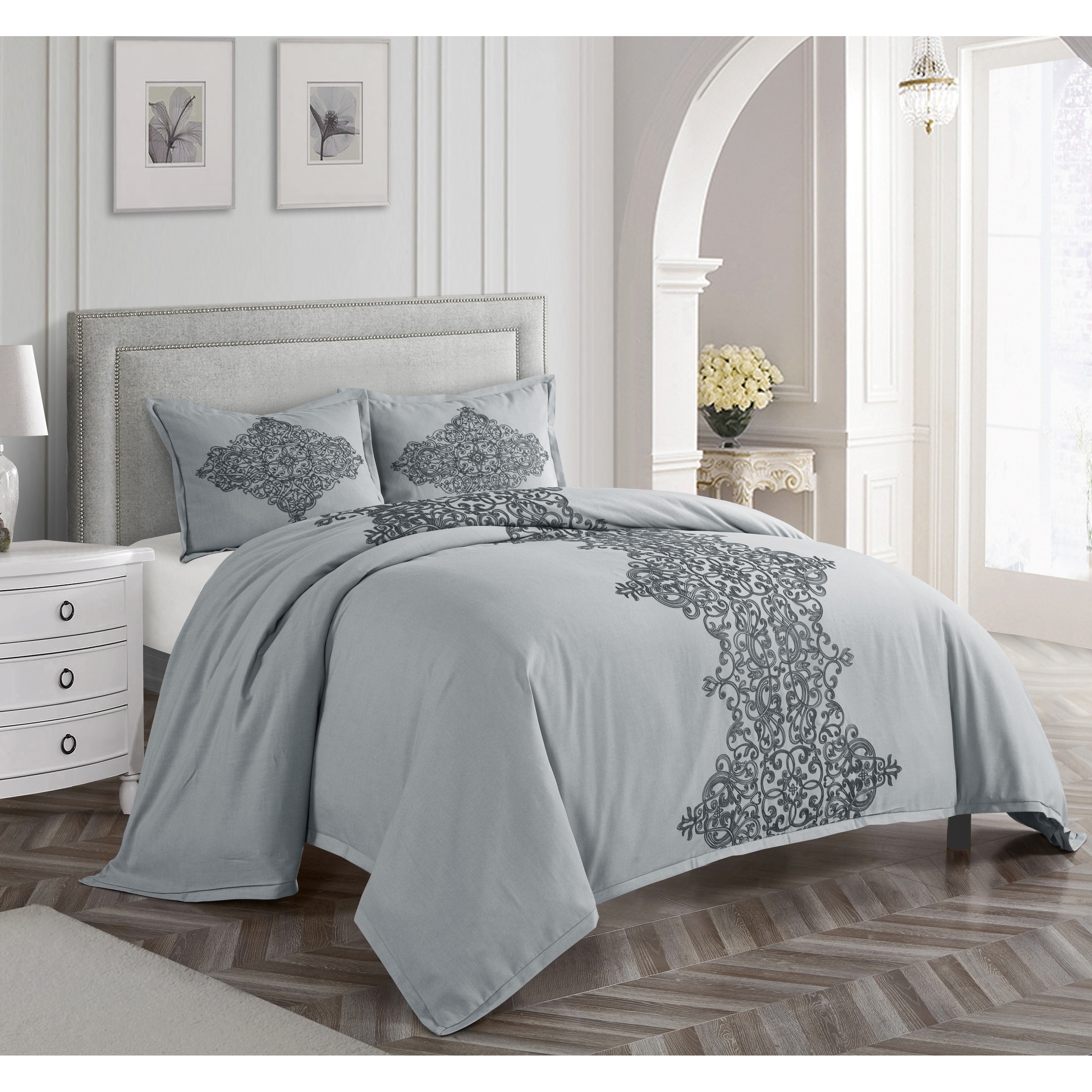 Vera Wang Noir Bouquet Reversible Quilted Breathable Cotton Comforter Set (Grey, 3 Piece)