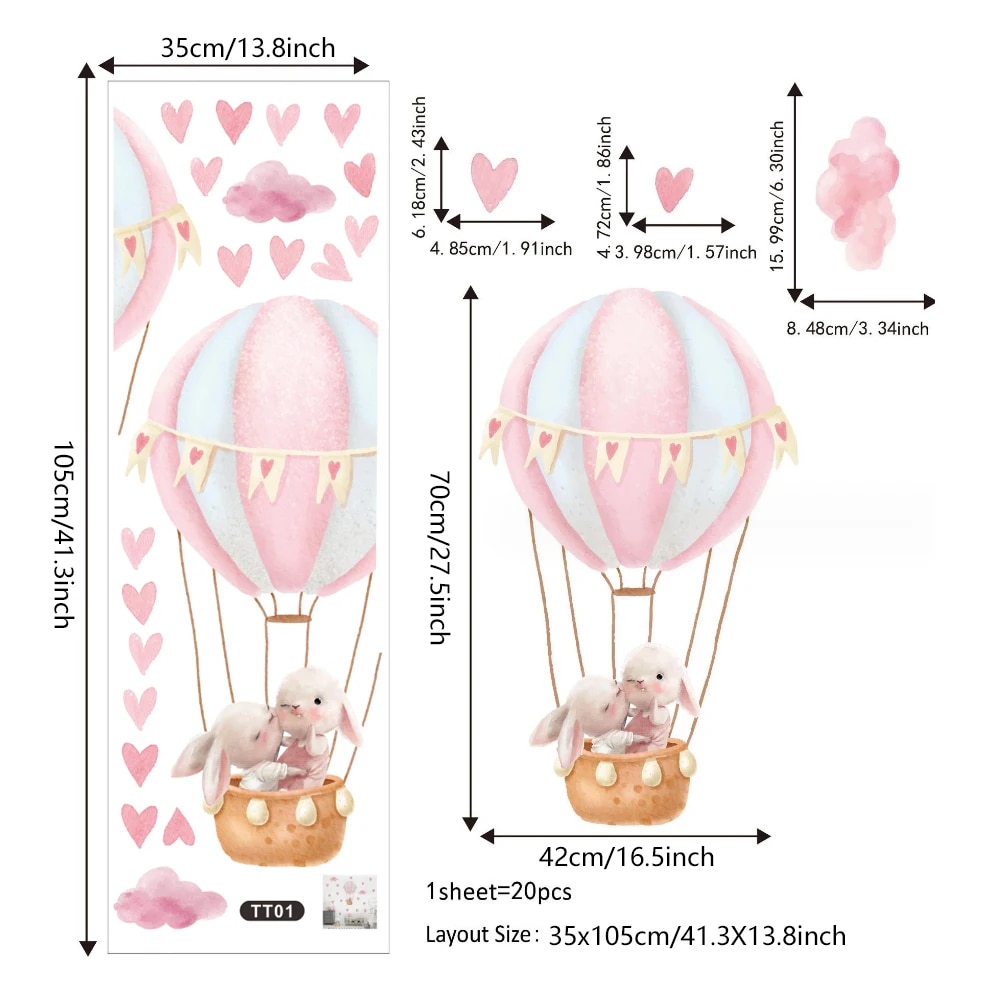 Pink Bunny Hot Air Balloon Wall Stickers: Kids Room & Nursery Decals 1