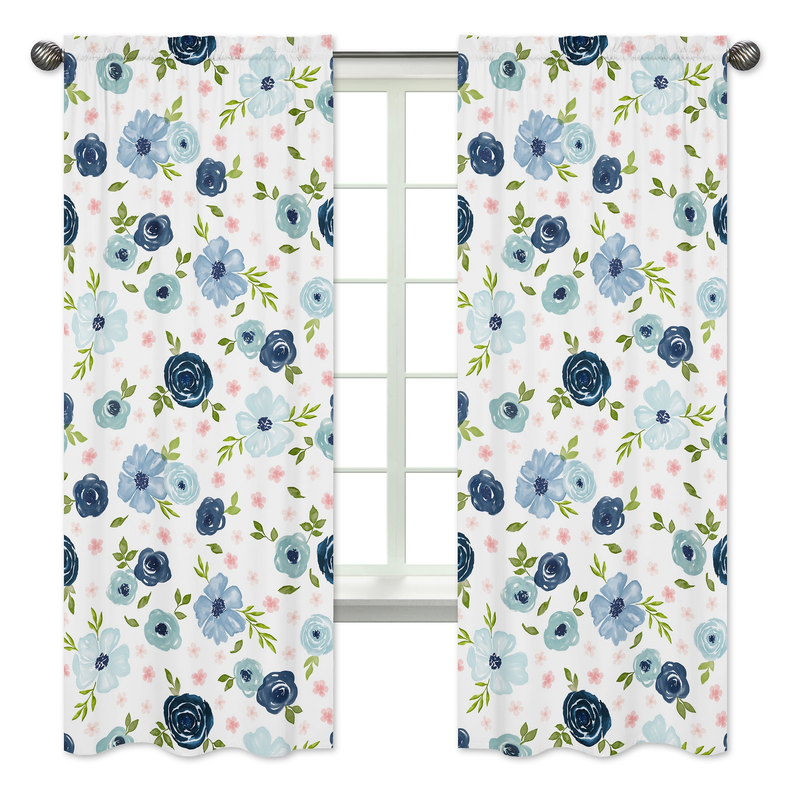 Navy Blue Pink Watercolor Floral 84in Window Treatment Curtain Panel Pair - Blush Green Shabby Chic Flower