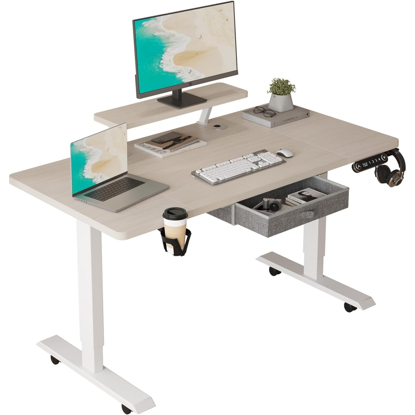 Electric Adjustable Standing Desk with Drawer, Storage Shelf, and Easy Assembly (Oak, 55x30)