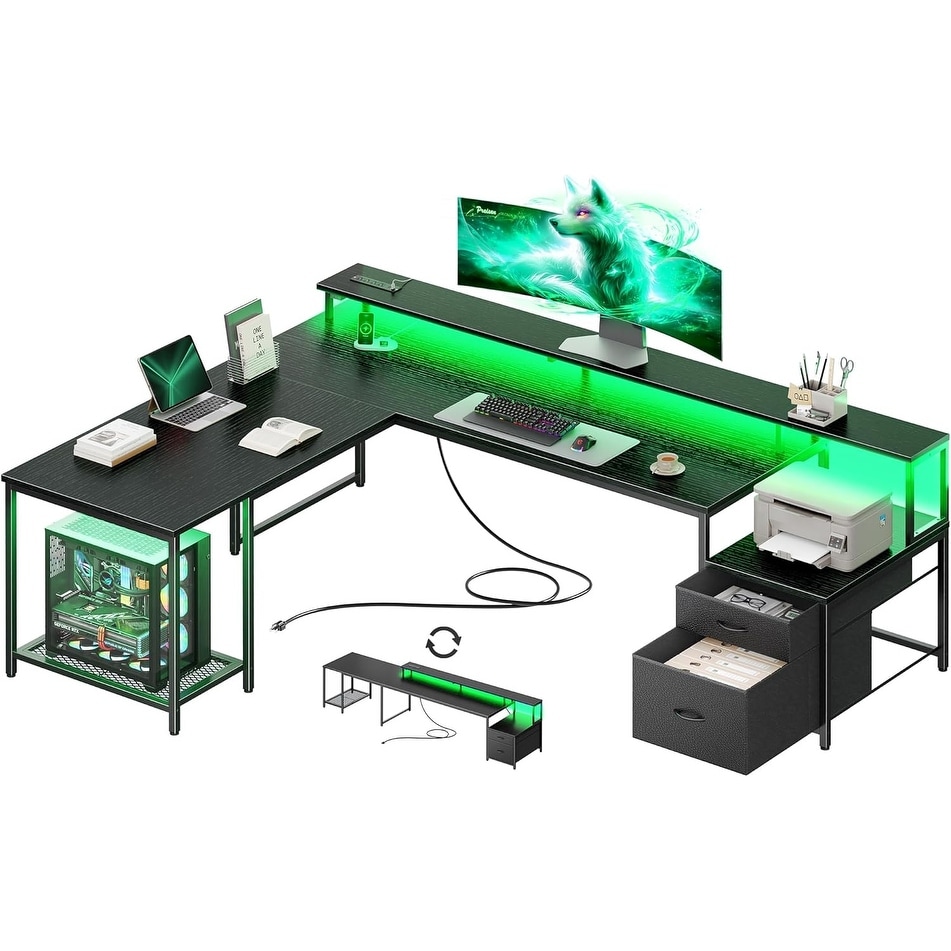 66 Inch L-Shaped Computer Desk with Power Outlets, LED Lights, Fabric Drawers, and Printer Stand