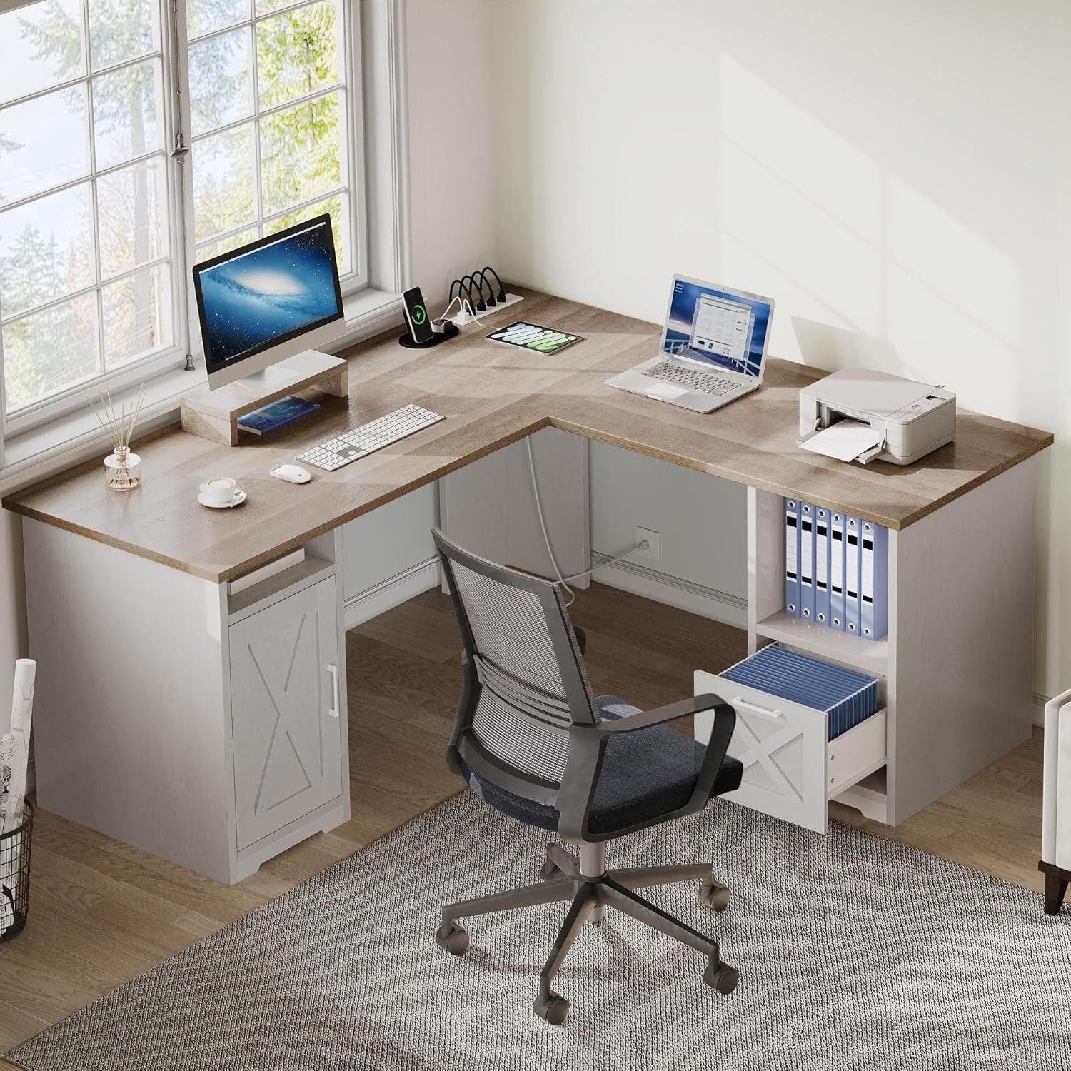 L Shaped Desk with File Drawer, 60 inch Corner Computer Desk with Power Outlets, Monitor Stand & Storage Shelves, Grey Wash
