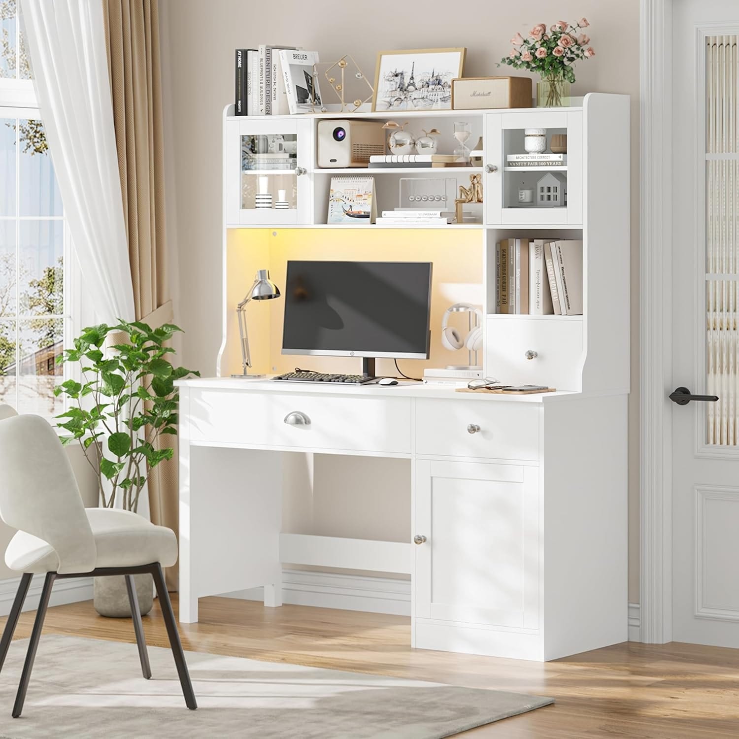 65-inch Office Desk with Hutch, RGB Lights, Power Outlet, 3 Doors & 3 Drawers, Adjustable Shelves, White