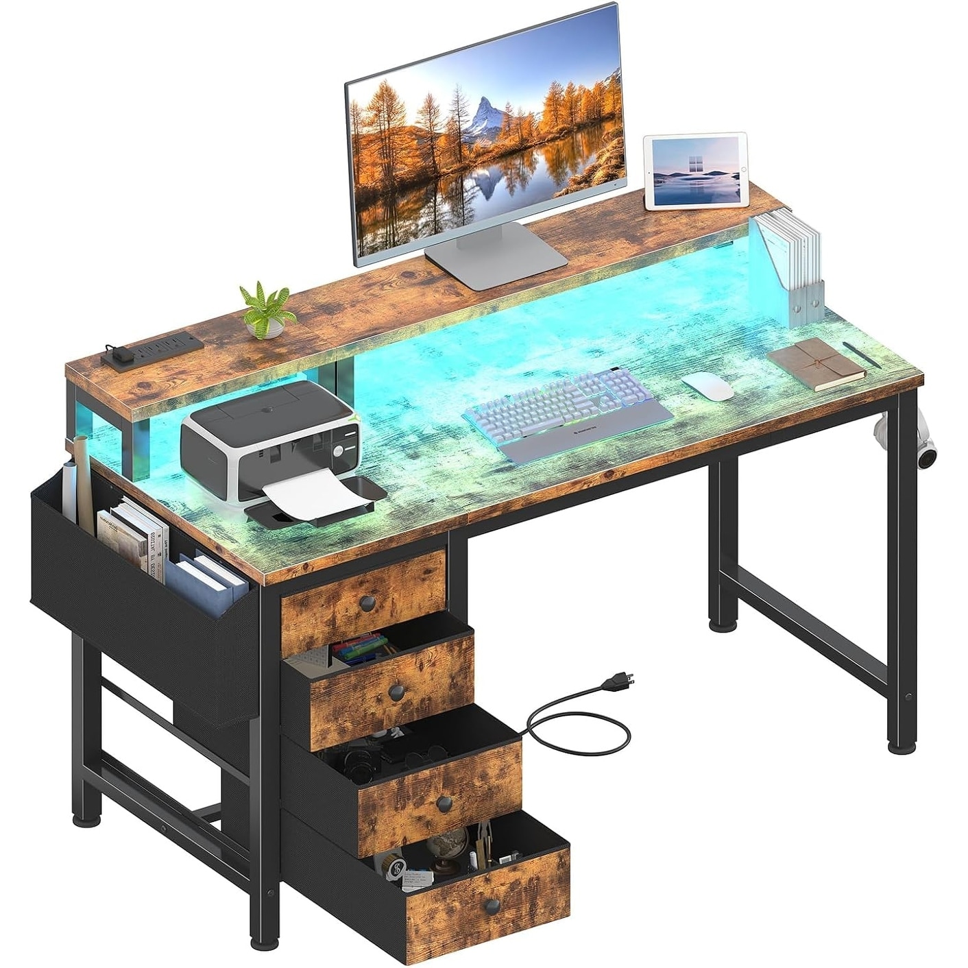47 Inch Computer Desk with LED Lights, Power Outlets, and 4 Drawers for Home Office and Gaming