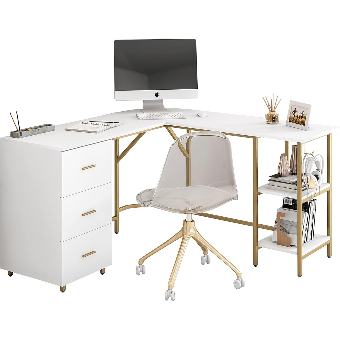 L-Shaped Computer Desk with Drawers & Storage Shelves, Modern Home Office Corner Table
