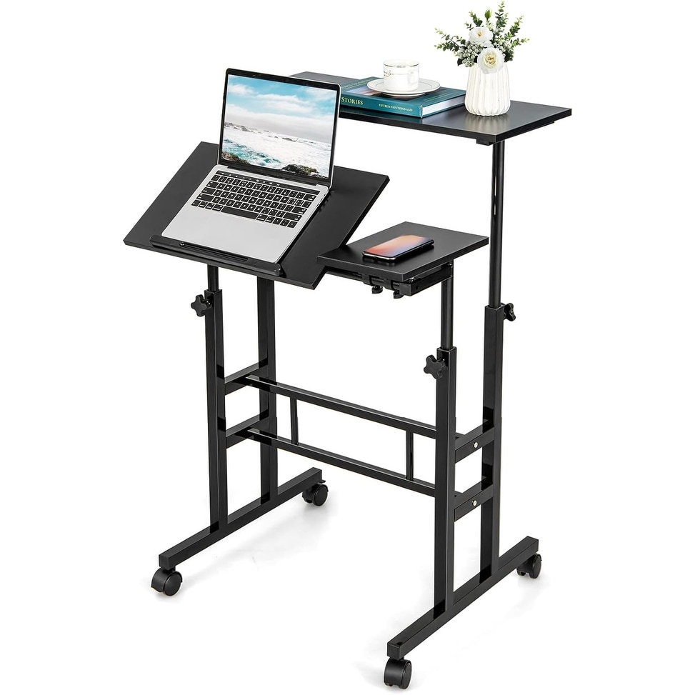 Height Adjustable Mobile Stand Up Desk with Tilting Tabletop & Lockable Wheels for Home Office