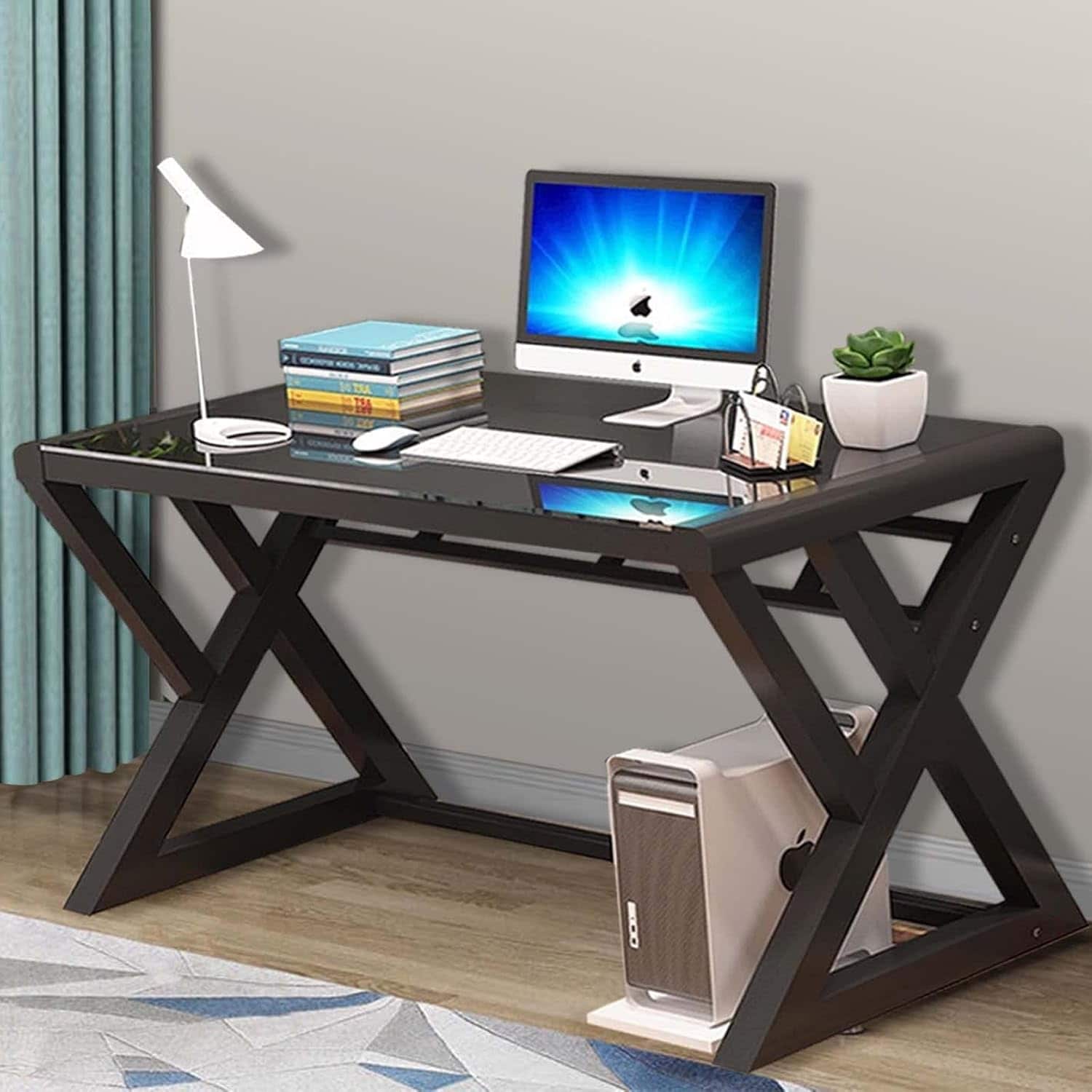 Modern Glass Top and Metal Frame Computer Desk for Home Office, Gaming, Study, and Writing, Black (55.1 inch)