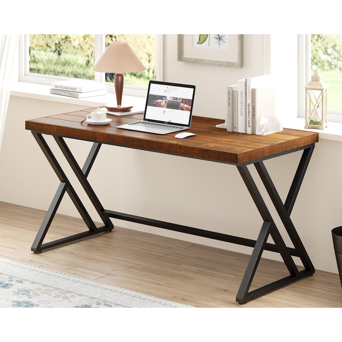 Modern Solid Wood Computer Desk, Rustic Farmhouse Workstation, Ergonomic Writing Table, 47 Inch, Brown