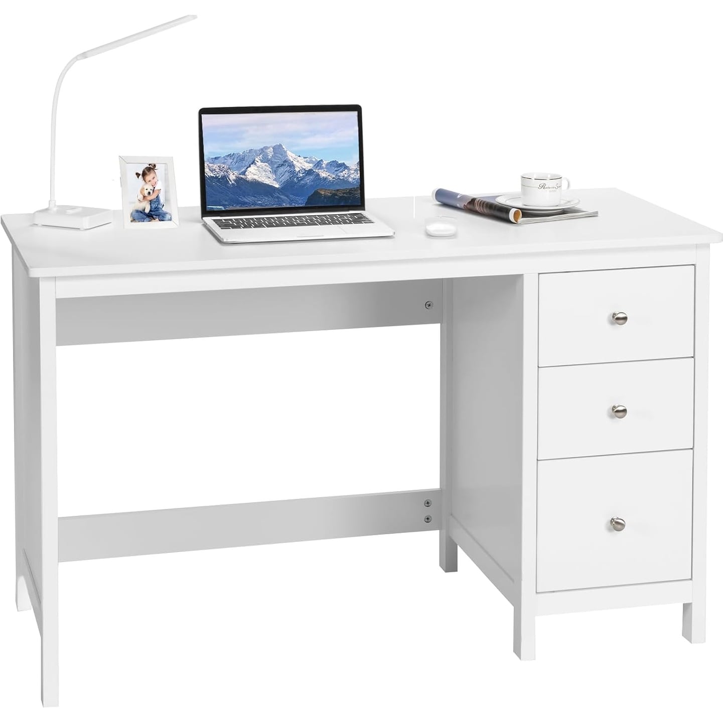 Modern White Computer Desk with 3 Drawers, 48'' x 20'' Compact Workstation for Home Office, Study, or Small Spaces