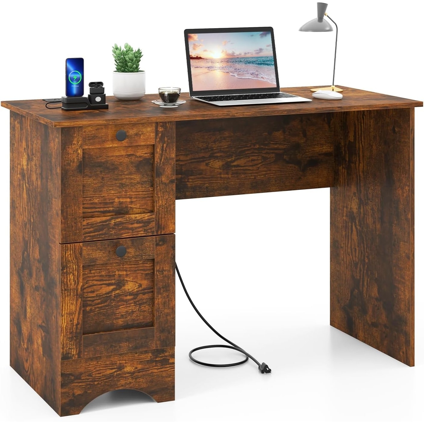 Compact Wooden Computer Desk with Drawers, Charging Station, and Ample Storage for Home Office