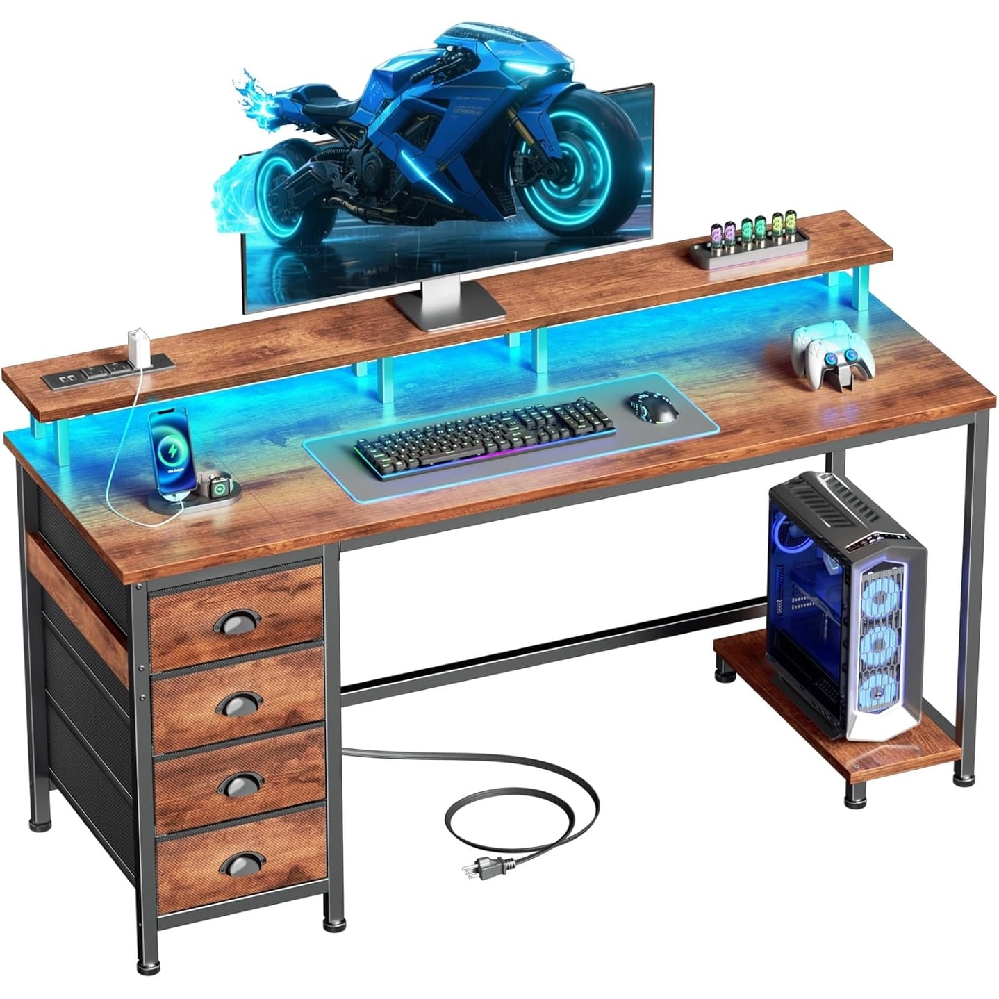 55 Inch Gaming Desk with LED Lights, Power Outlets, 4 Fabric Drawers & Adjustable Monitor Stand for Home Office