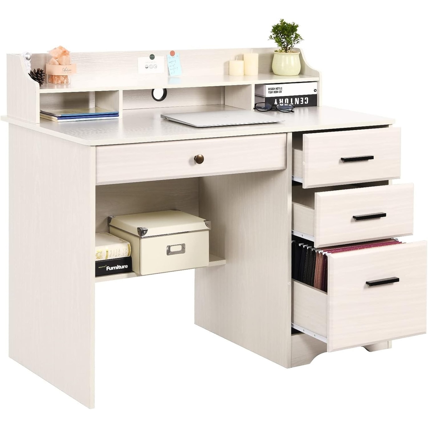 Vintage Style White Computer Desk with 4 Drawers & Hutch - Spacious Home Office Table for Small Spaces (Off-White)