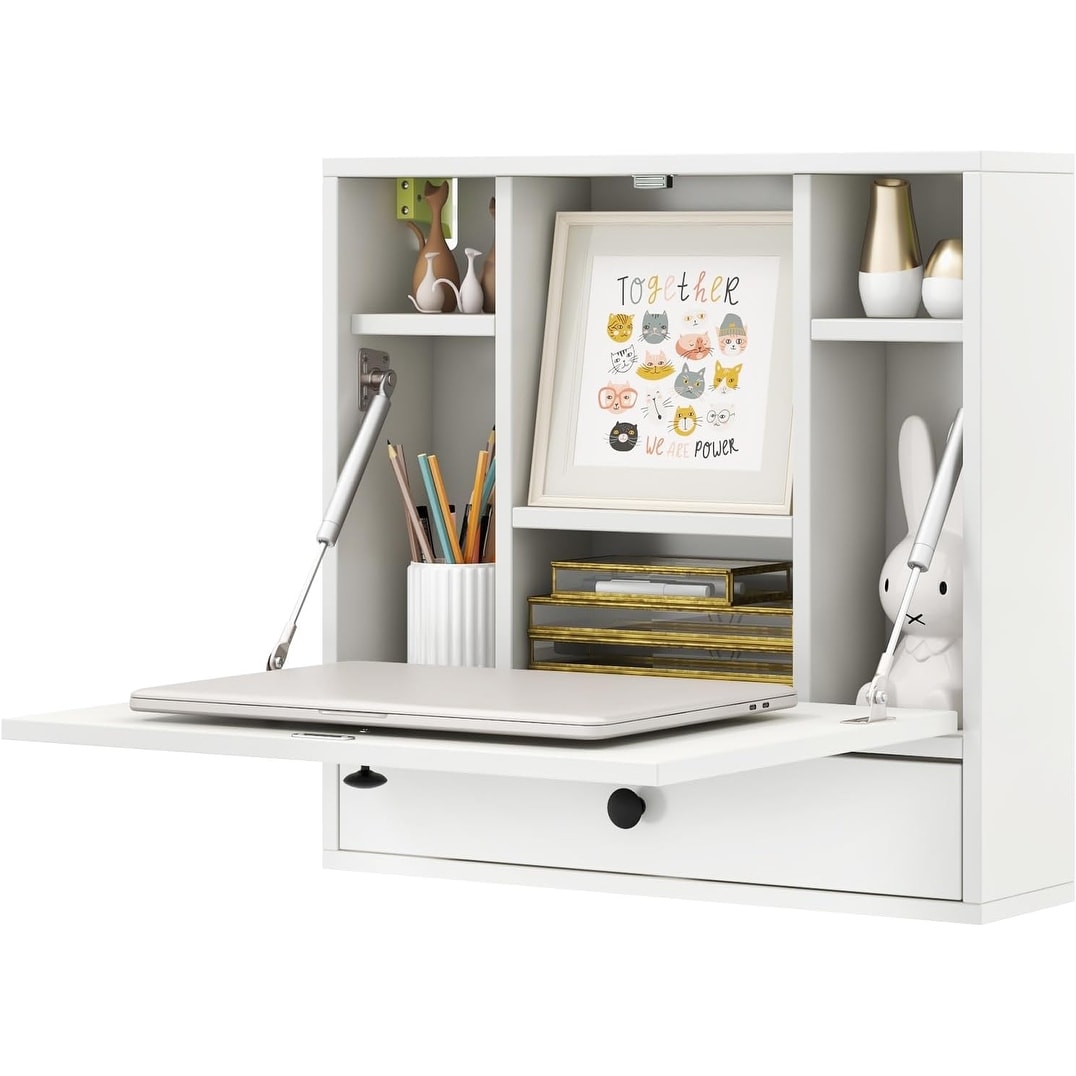 Space-Saving Folding Wall Desk with Storage Drawer and Shelves, Fold Down Corner Floating Desk for Small Spaces