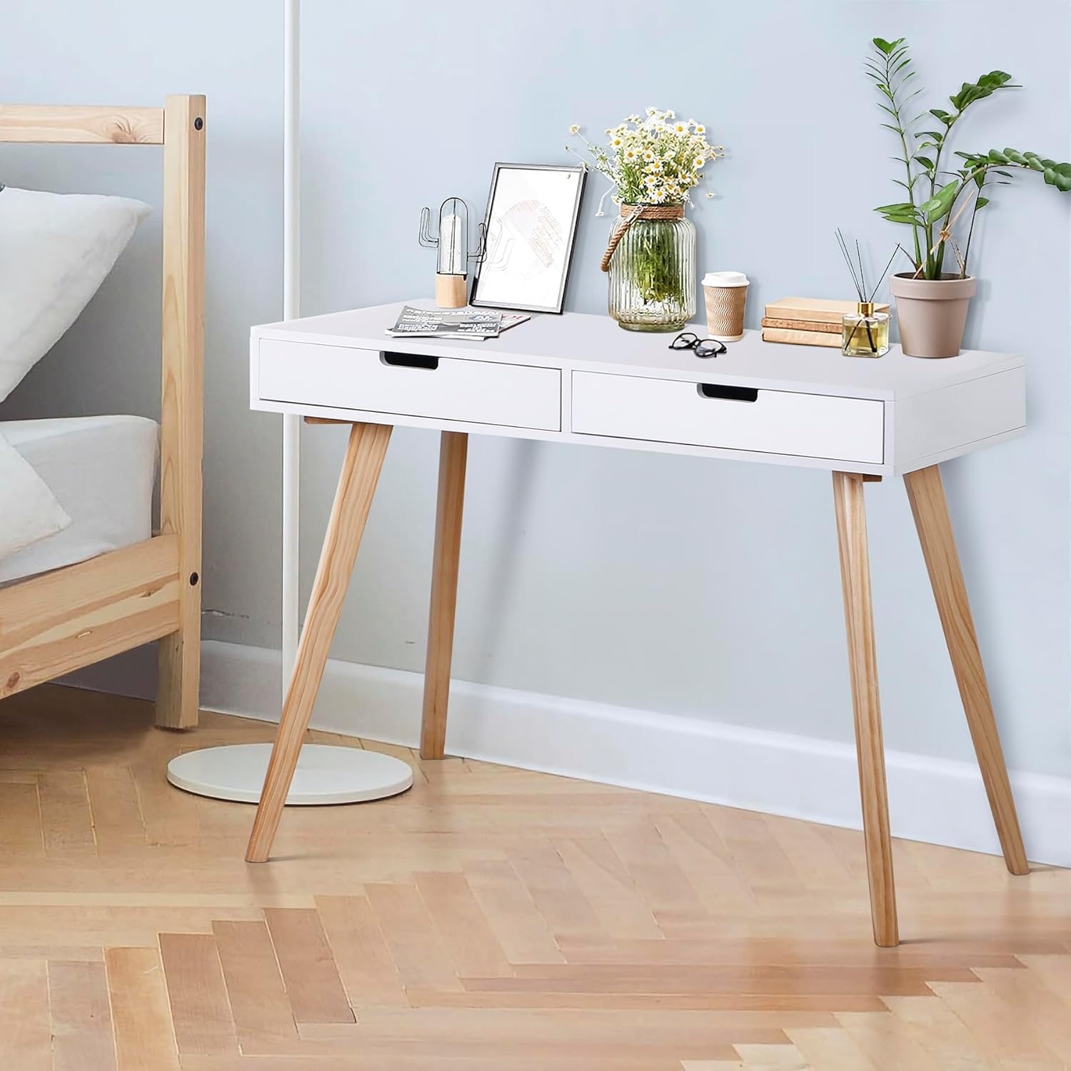 Mid Century Modern Writing Desk with Two Drawers and Solid Wood Legs for Home Office