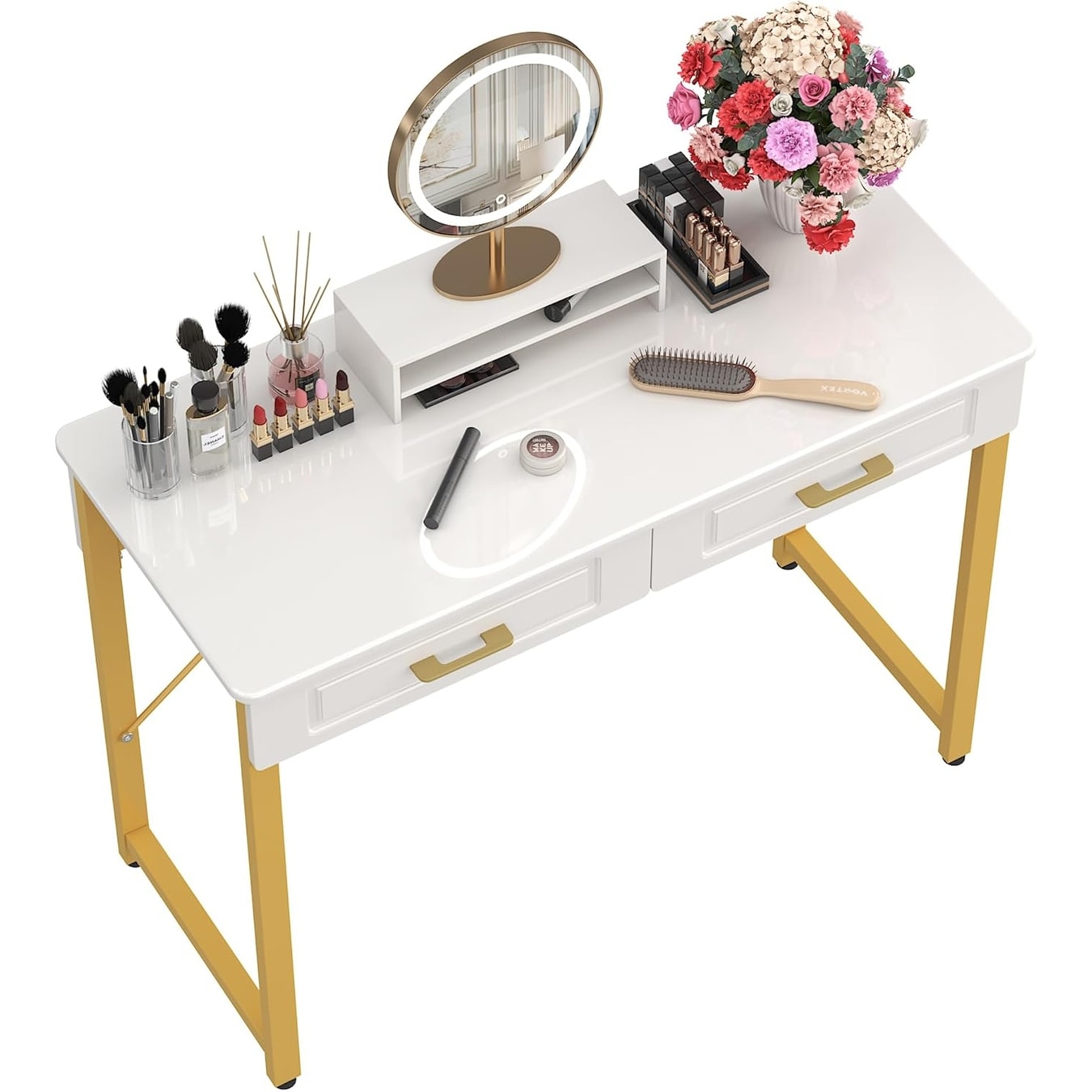 Modern Makeup Table with 2 Drawers, Gold Frame, Glossy Desktop, No Mirror