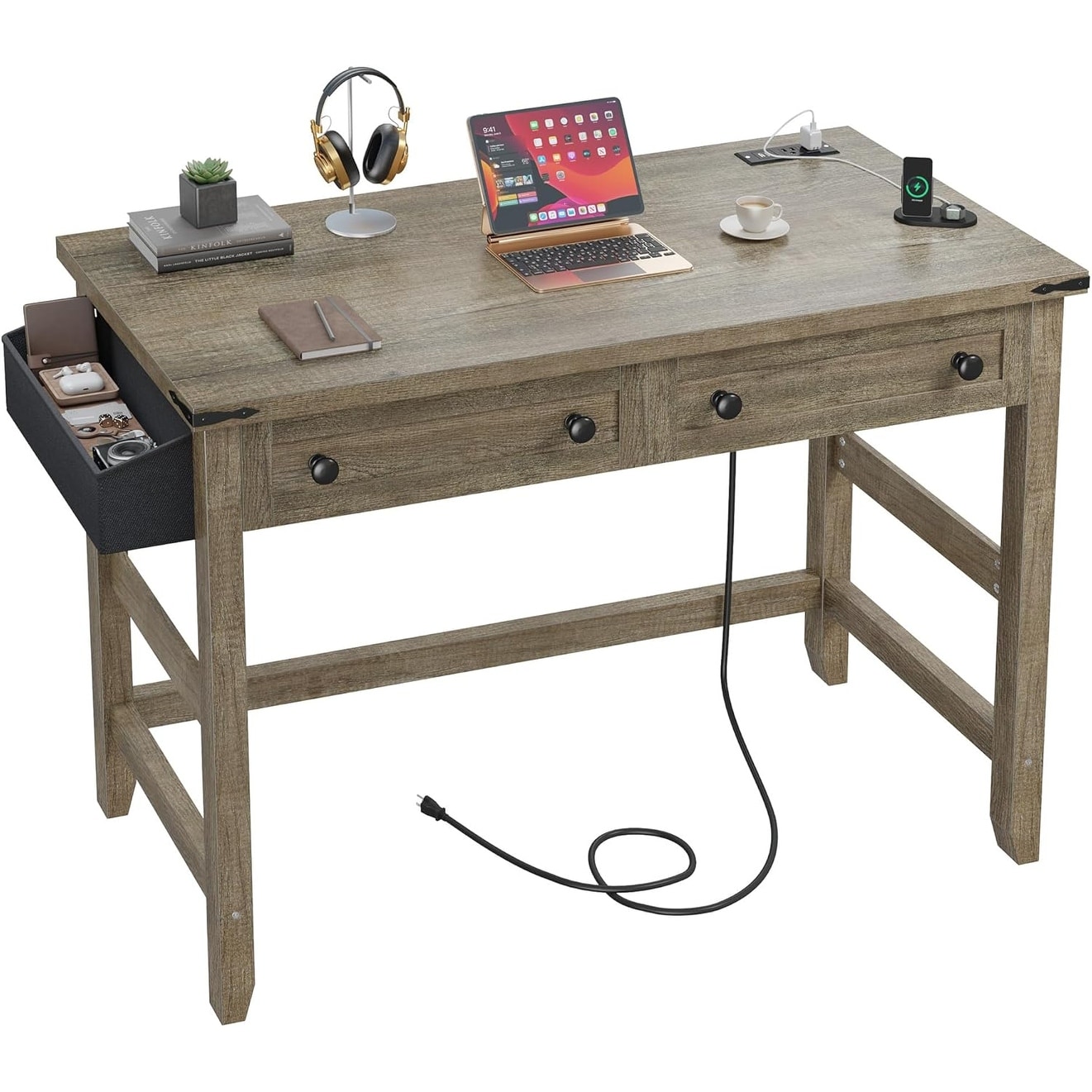 40 Inch Small Desk with Power Outlets, Drawers, and Side Pocket, Dark Rustic Oak