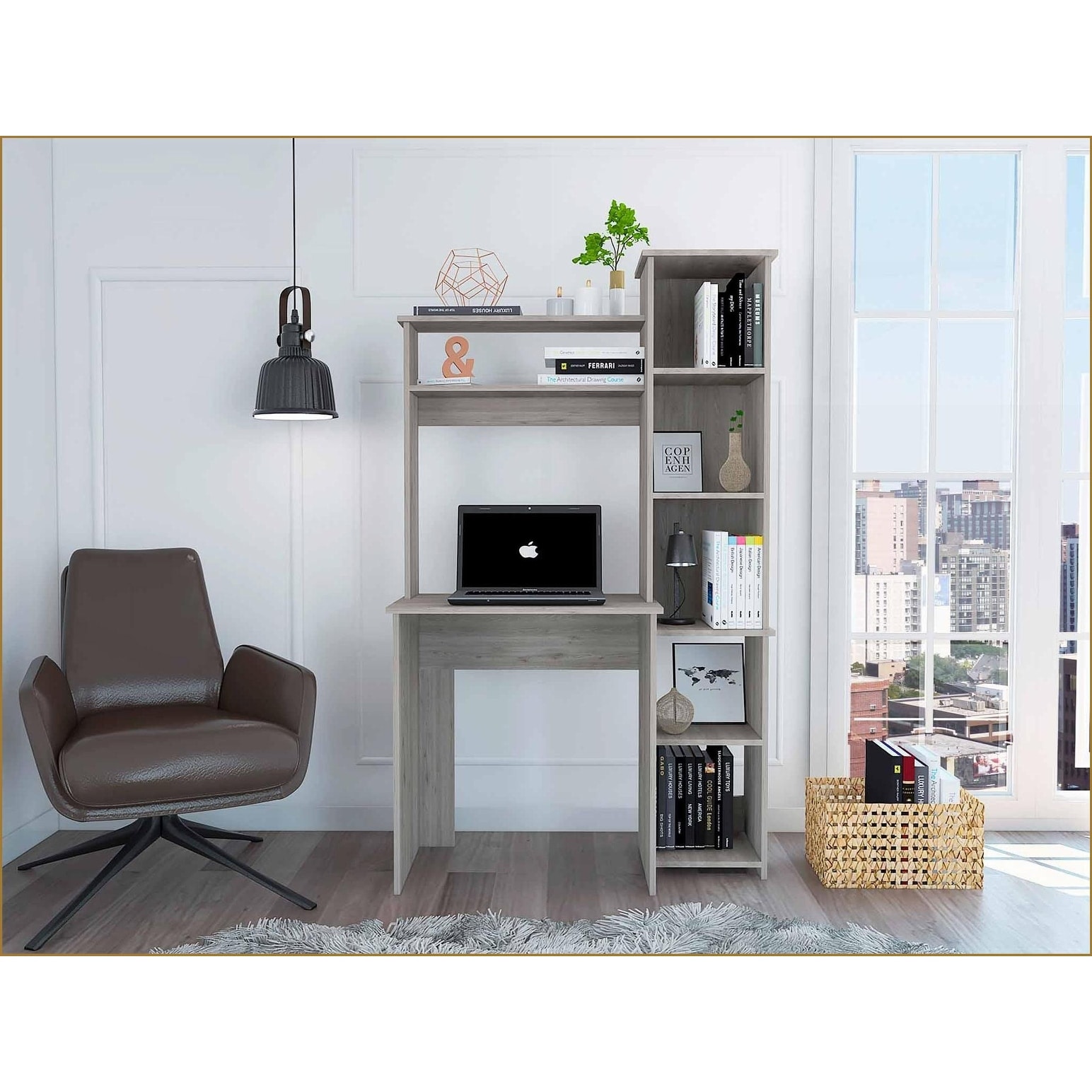 Desks, Modern Light Grey Writing Desk with Built-in 7-Shelf Bookcase, 38.7inW x 17.8inD x 63.9inH, Particle Board