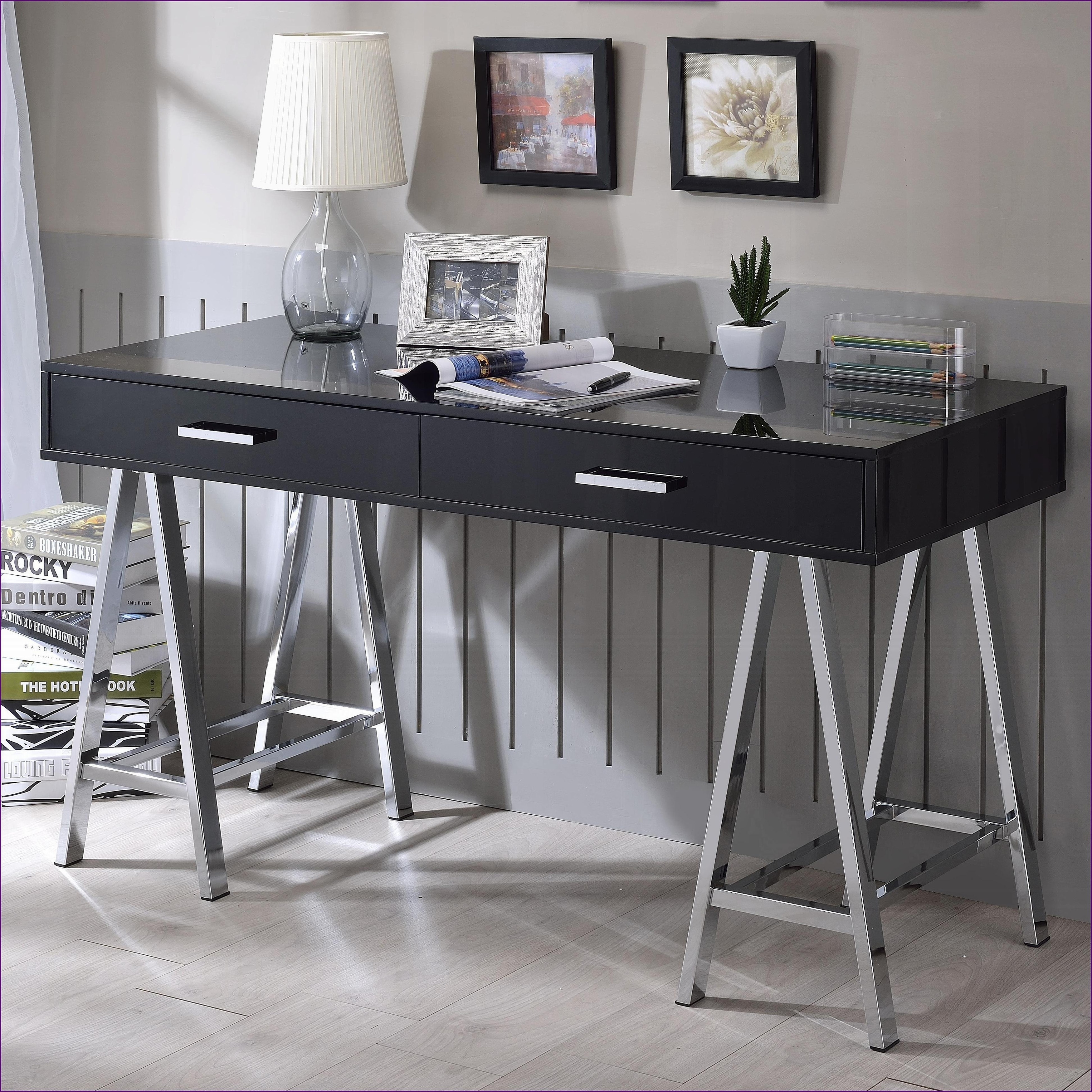 Desks, Modern 2-Drawer Writing Desk - Black High Gloss, Chrome Base, 32inH x 54inW x 22inD, Black and Silver, Wood and Metal