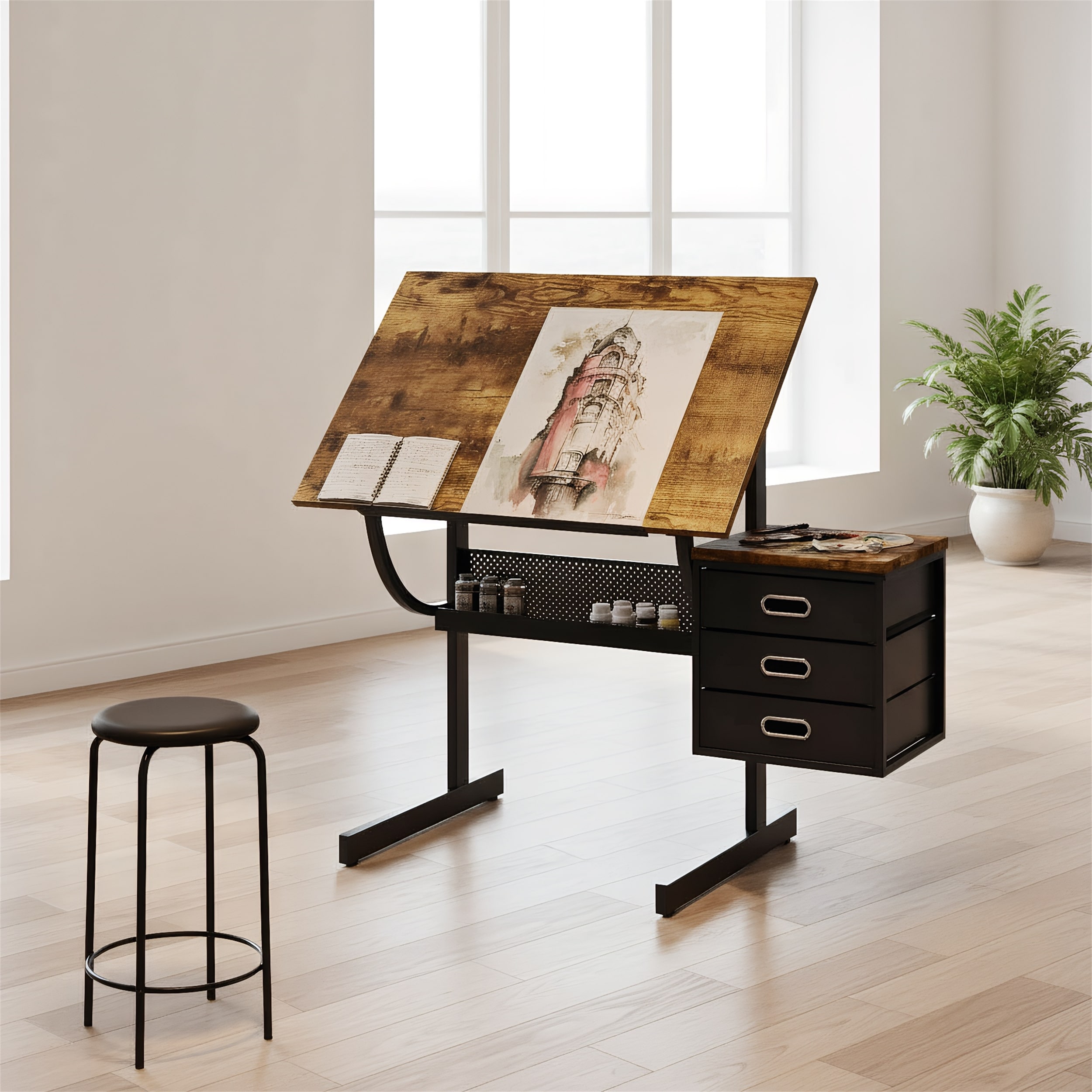 Black Adjustable Drafting Table w/ 3 Drawers & Stool, 0-75 Degree Tilt
