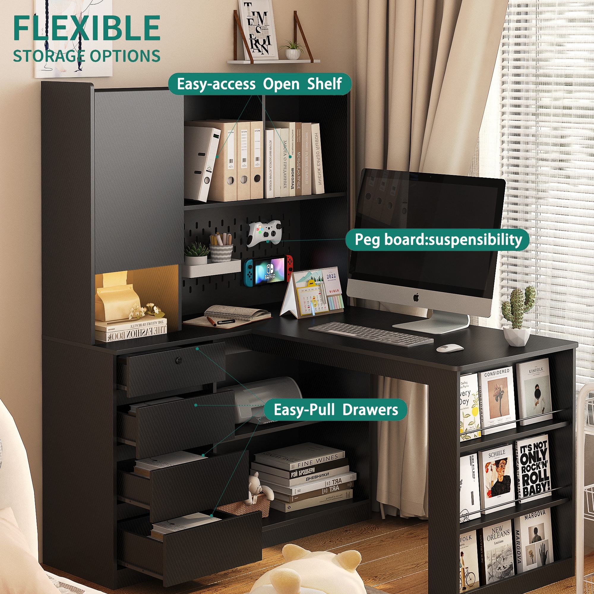 Corner Computer Desk with Charging Station, L Shaped Gaming Desk Hutch Desk Office Desk with Drawers, Bookshelf & LED Light