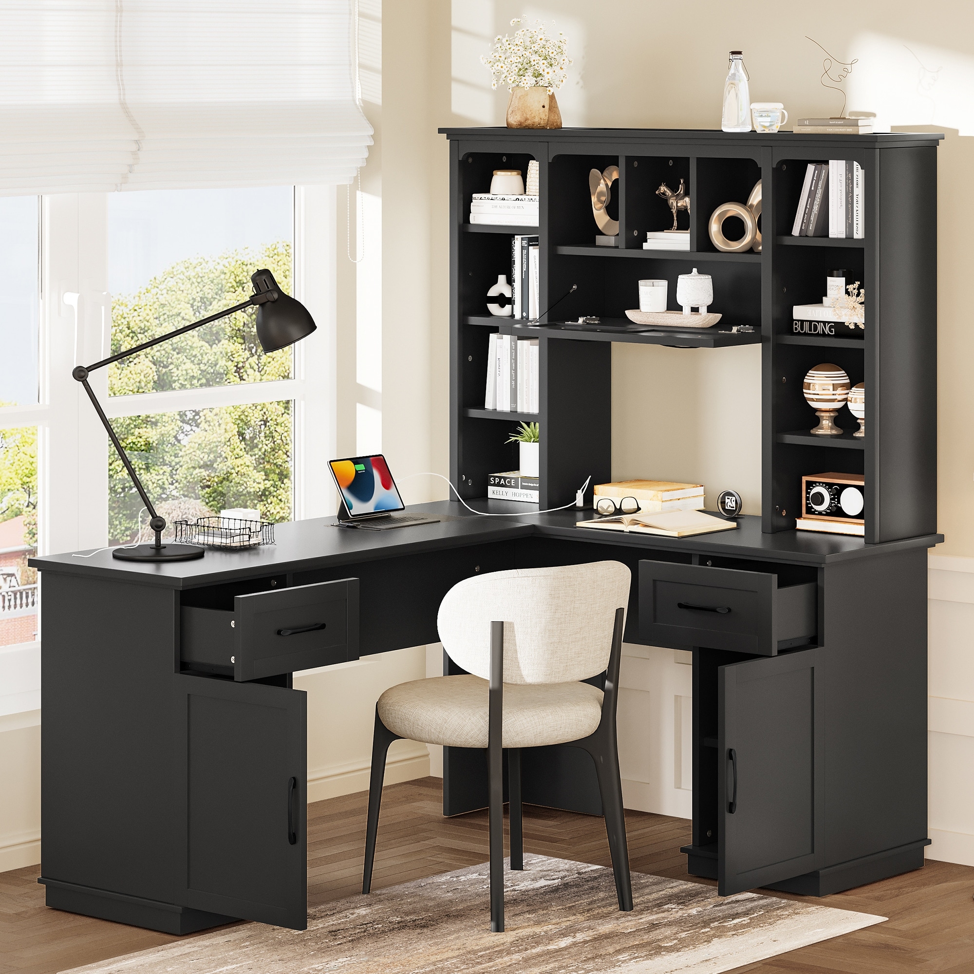 Home Office Desk Executive Desk with Bookshelf, Cabinets & Drawers, 2-in-1 L-Shaped Computer Desk with Charging Ports
