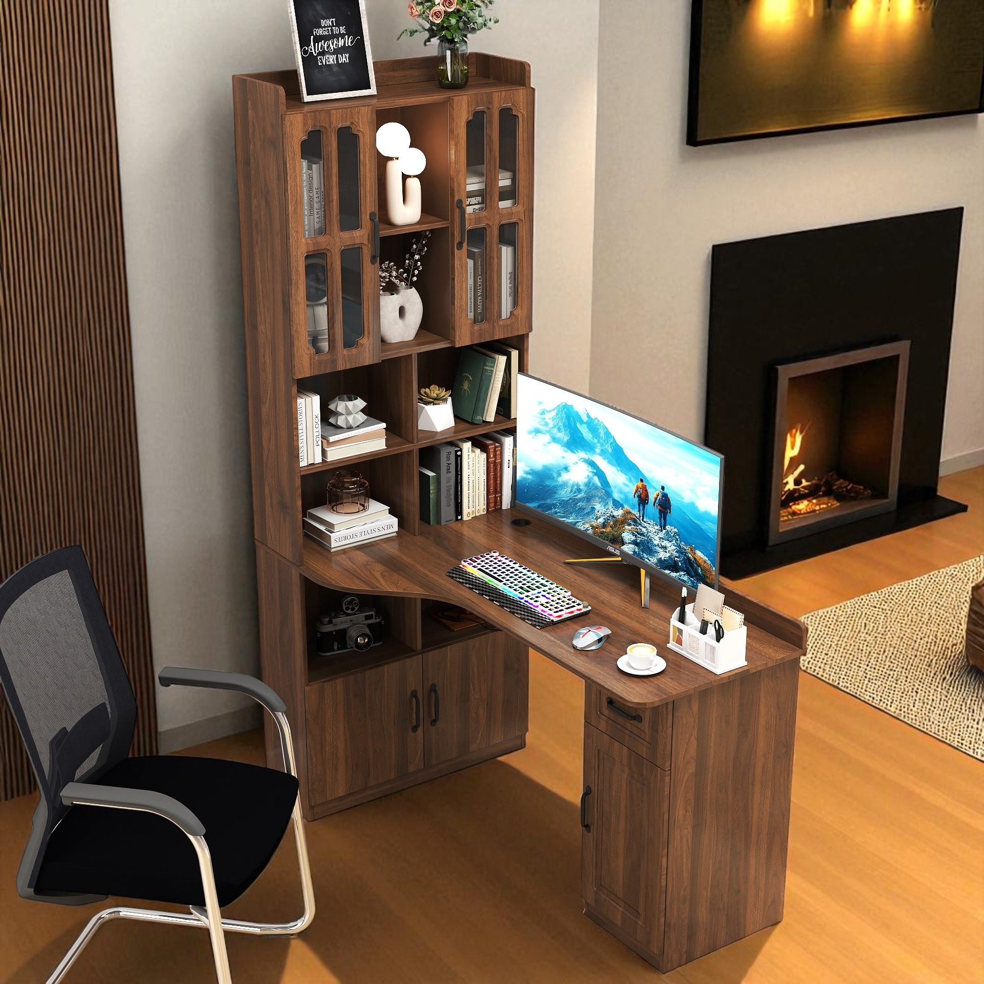 L-Shaped Corner Computer Desk for Home Office, Study Desk with Drawers, Bookshelf & Hutch, 2-in-1 Space-Saving Design