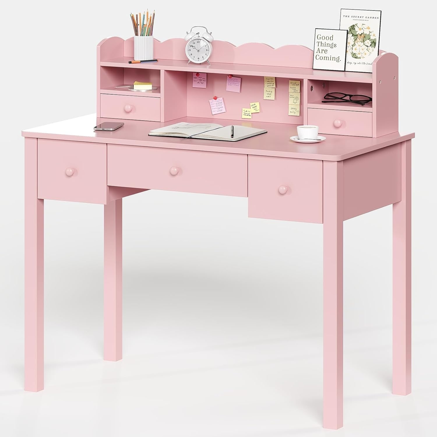 Modern Pink Writing Desk with Hutch & Drawers - Compact Home Office Workstation