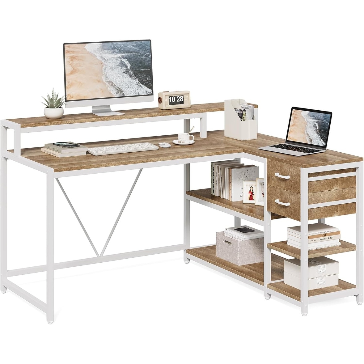 55-Inch Reversible L-Shaped Computer Desk with Drawers and Shelves, Sturdy Corner Desk for Home Office, Gaming, and Study