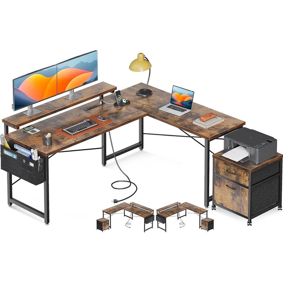55 Inch L Shaped Office Desk with Adjustable Monitor Stand, Power Outlet, File Cabinet, and Storage Bag