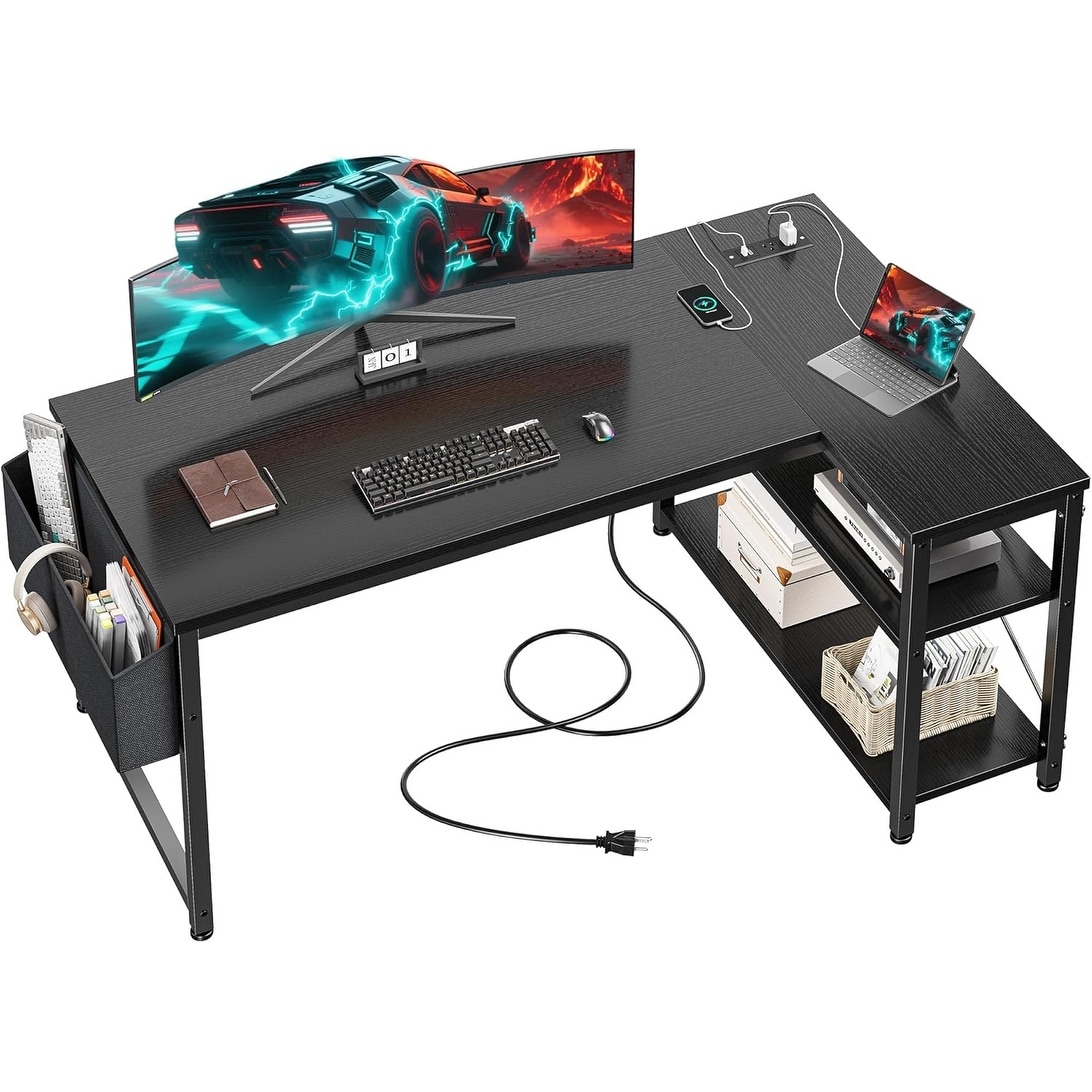 40 Inch L-Shaped Computer Desk with Storage Shelves, Power Outlets, and Side Bag for Home Office, Bedroom, or Living Room
