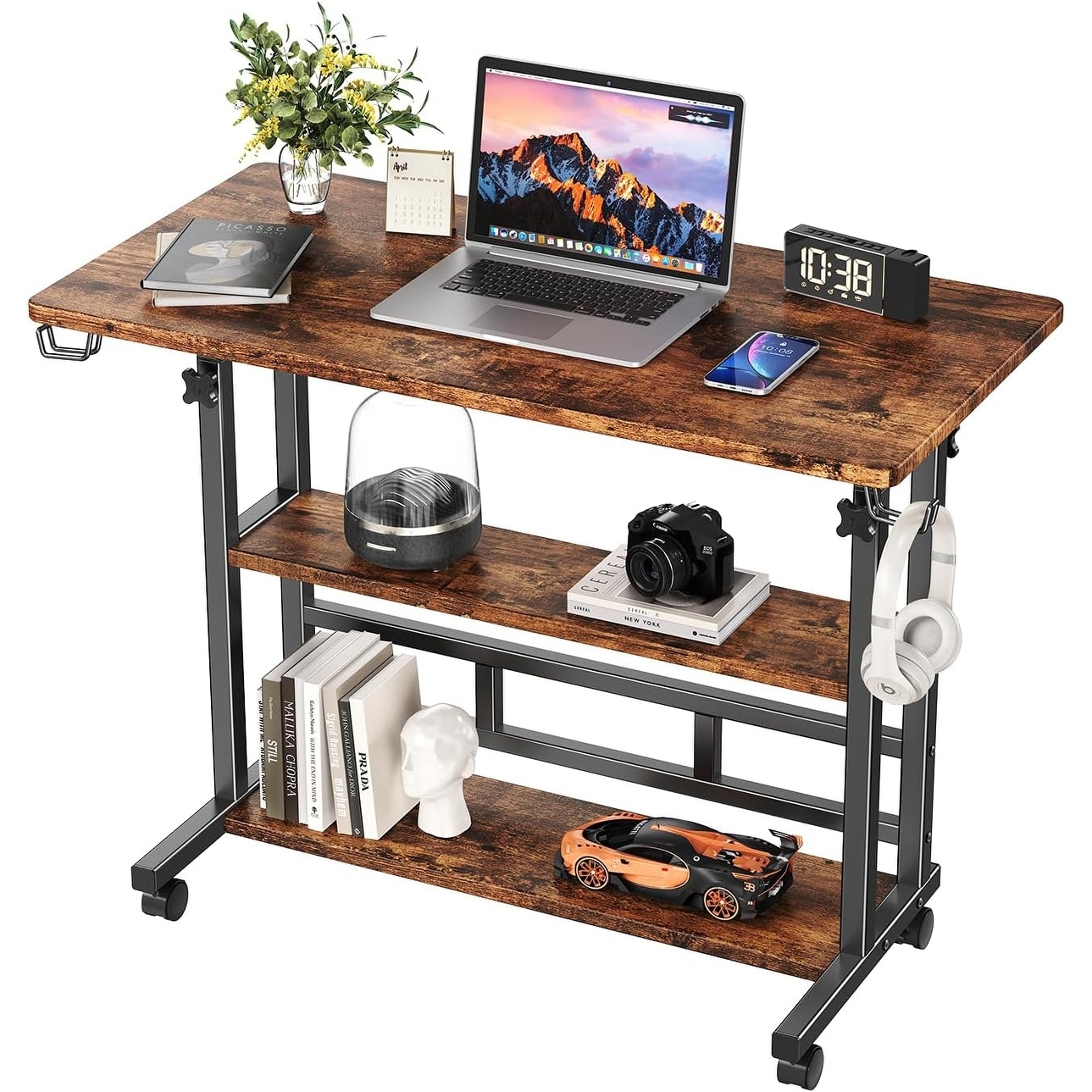 Adjustable Height Mobile Computer Desk with Storage Shelves and Universal Wheels, 31.5 Inch Portable Laptop Table