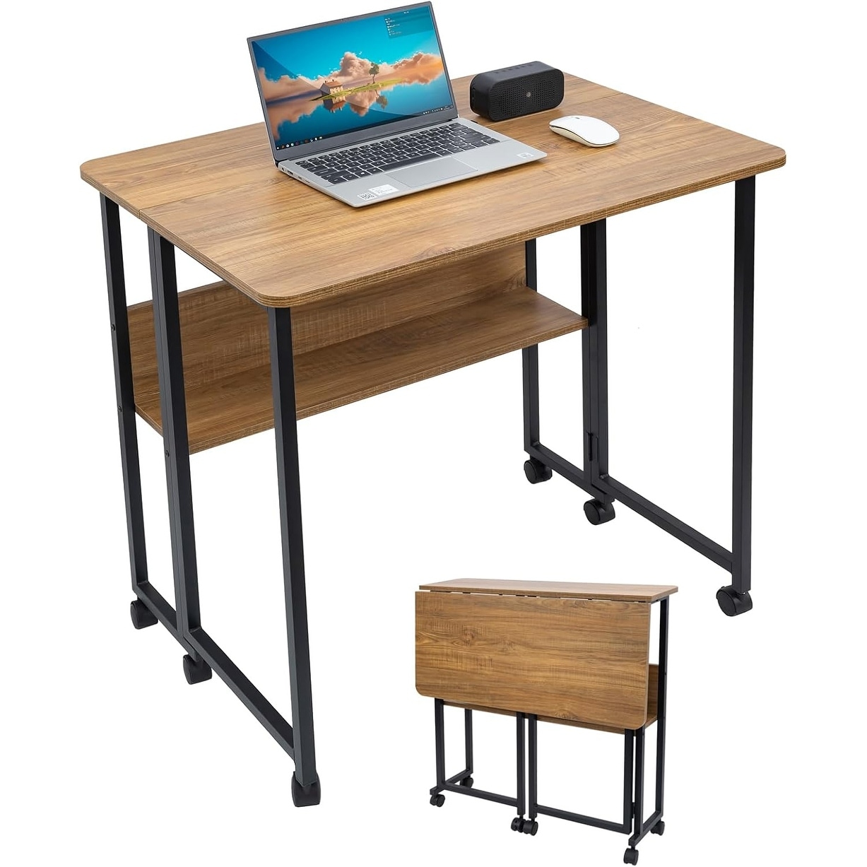 Foldable Mobile Desk with Wheels & Storage Shelf, Portable Computer Table for Home Office, Bedroom, Living Room