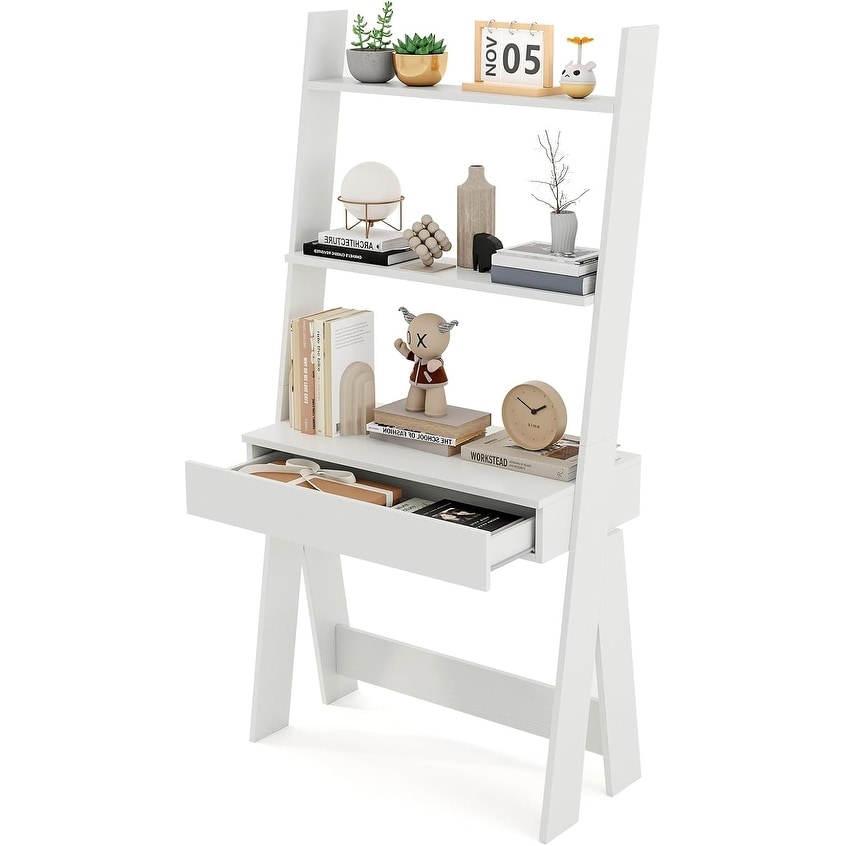 3 Tier Ladder Desk with Drawer, 33'' Width Freestanding Bookshelf, Leaning Computer Desk with Shelves for Small Space, White
