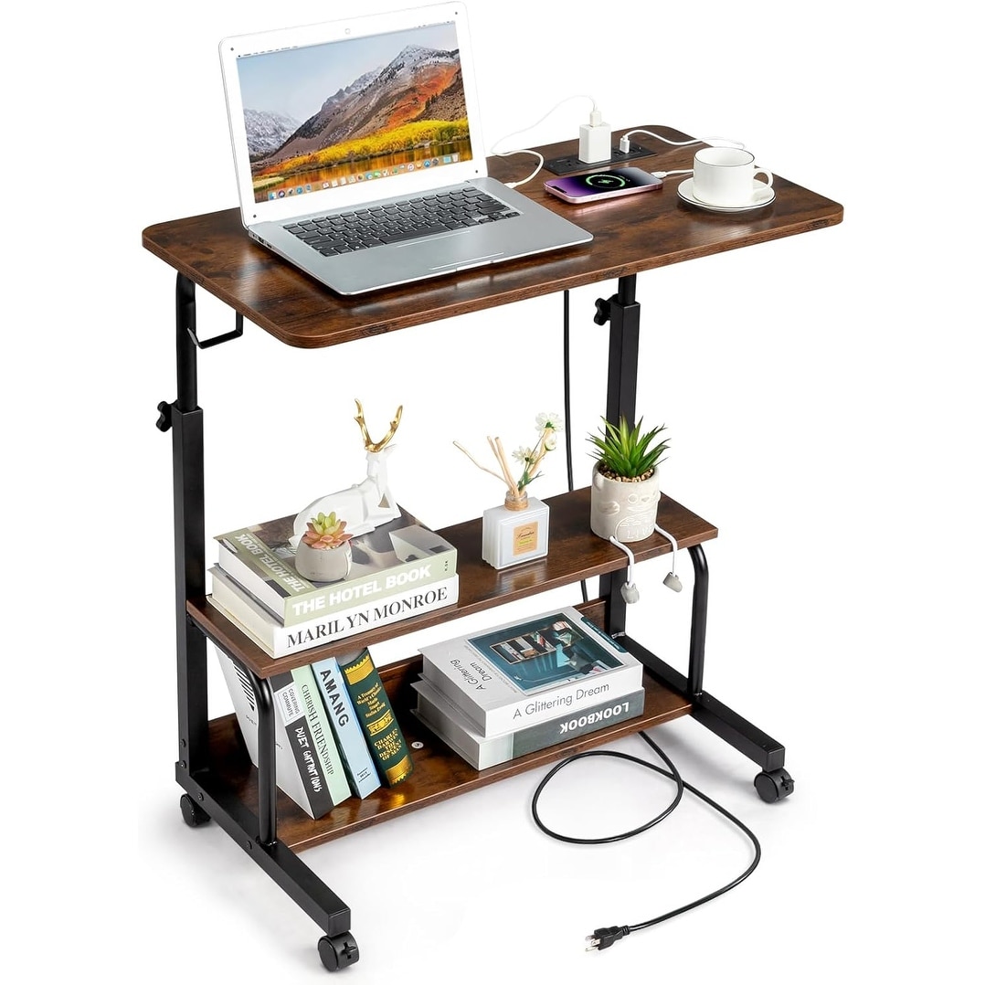 31.5 Inch Portable Height Adjustable Rolling Desk with Power Outlets, USB Ports, and Storage Shelves