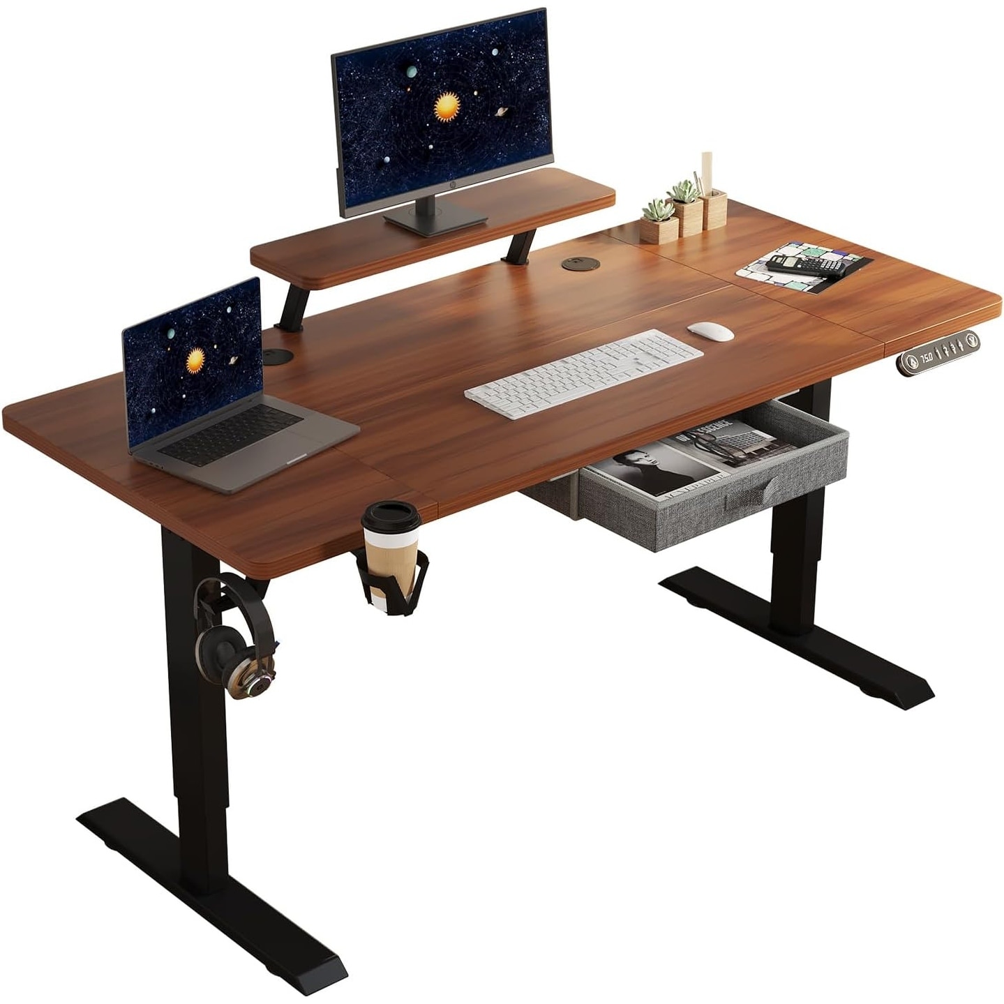 63x30 Inches Electric Height Adjustable Sit Stand Desk with Storage Shelf and Drawer