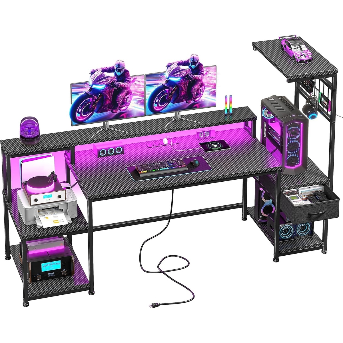 63-inch Gaming Desk with LED Lights, Drawers, Monitor Stand, and Storage Shelves, Black