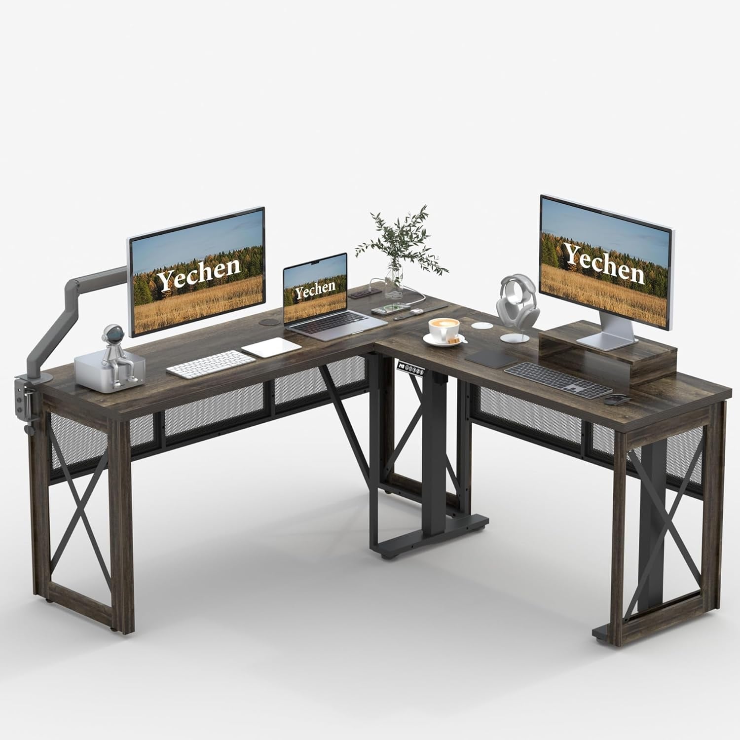 L-Shaped Electric Height Adjustable Corner Desk with 4-in-1 Outlet, 61x60, Brown